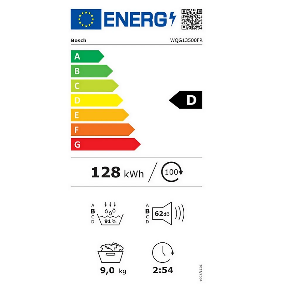 Sèche-linge pompe à chaleur 60cm 9kg Bosch – Sèche-linge pompe Série 6 WQG13500FR de Bosch.Détecte automatiquement quand votre linge est sec.Chargez jusqu’à 10 kg de vêtements dans votre sèche-linge ou lave-linge séchant doté de la technologie AutoDry. Il les séchera précisément jusqu’au degré souhaité : juste assez sec pour être repassé ou extra sec et prêt à ranger. Des capteurs mesurent en permanence la température et l’humidité à l’intérieur du tambour pour protéger votre linge de tout séchage excessif. Obtenez ainsi un séchage toujours impeccable.Paramètres optimisés pour les petites charges.Option demi-charge : optez pour le programme le mieux adapté aux petites charges (poids et durée).Condenseur à nettoyage automatique des peluches.Les sèche-linge à pompe à chaleur dotés d’un condenseur auto-nettoyant protègent vos vêtements et restent très économes en énergie. Grâce à la technologie Self Cleaning Condenser, le condenseur est nettoyé automatiquement jusqu’à quatre fois pendant le processus de séchage, ce qui maintient des performances énergétiques optimales cycle après cycle. Les sèche-linge à pompe à chaleur de Bosch sont conçus pour fonctionner efficacement tout en séchant délicatement vos vêtements.Écran LED plus grand et meilleure visibilité.Nos sèche-linge sont équipés d’un écran LED ultra-large. Une fonctionnalité à la fois design et pratique. En effet, grâce à des icônes faciles à comprendre et des textes clairs, vous pouvez rapidement sélectionner les réglages les mieux adaptés à votre linge. Et pour une expérience encore plus personnalisée, l’écran vous donne accès à des fonctionnalités supplémentaires. Lancer un cycle de séchage devient un jeu d’enfant ! – Type de produit : Sèche lingeType d’installation : Pose-libreCapacité maximale : 9.0 kgPuissance de raccordement : 800 WIntensité : 10 ATension : 220-240 VFréquence : 50 HzClasse d’efficacité énergétique :