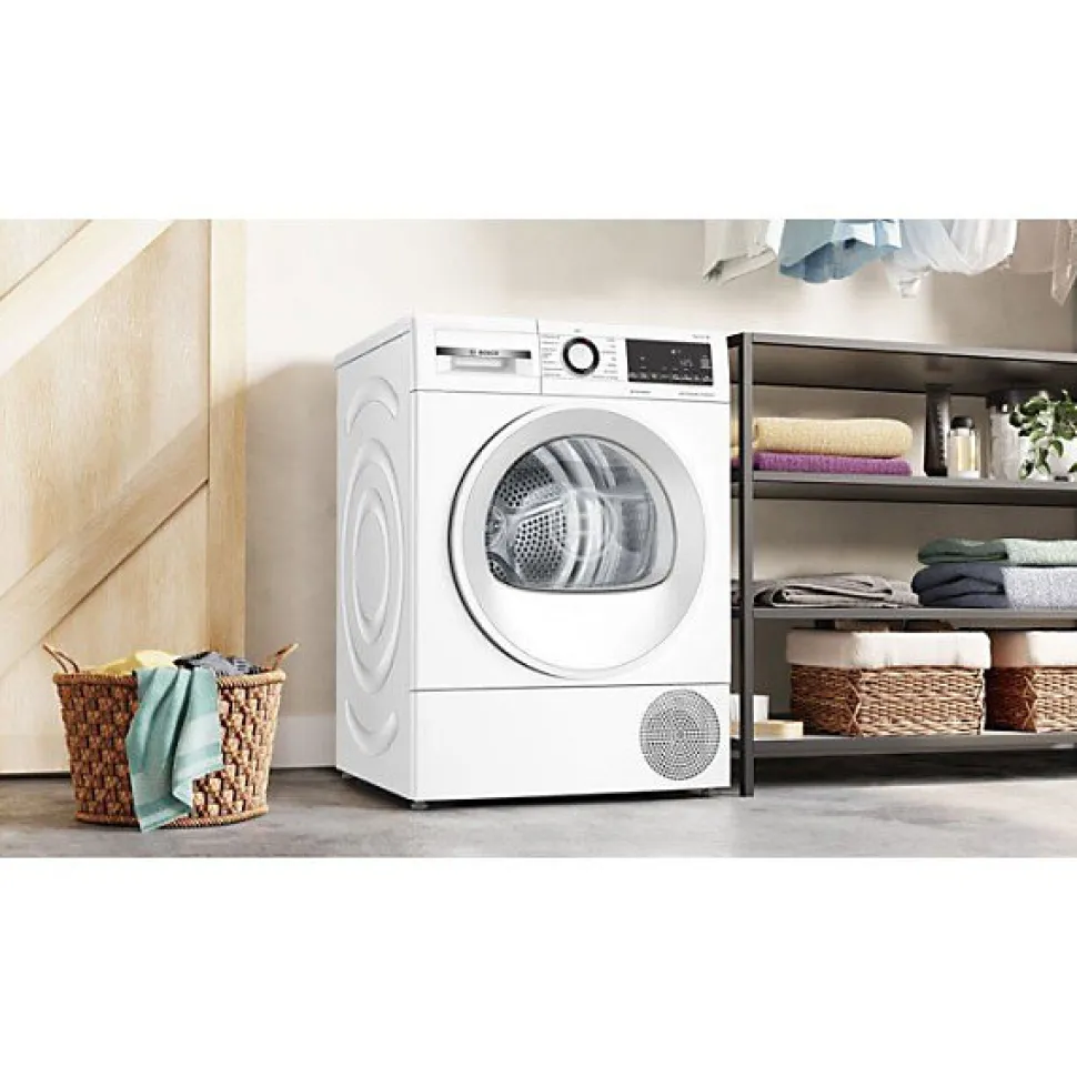 Sèche-linge pompe à chaleur 60cm 9kg Bosch – Sèche-linge pompe Série 6 WQG24502FR de BoschCondenseur à nettoyage automatique des peluches.Les sèche-linge à pompe à chaleur dotés d’un condenseur auto-nettoyant protègent vos vêtements et restent très économes en énergie. Grâce à la technologie Self Cleaning Condenser, le condenseur est nettoyé automatiquement jusqu’à quatre fois pendant le processus de séchage, ce qui maintient des performances énergétiques optimales cycle après cycle. Les sèche-linge à pompe à chaleur de Bosch sont conçus pour fonctionner efficacement tout en séchant délicatement vos vêtements.Détecte automatiquement quand votre linge est sec.Chargez jusqu’à 10 kg de vêtements dans votre sèche-linge ou lave-linge séchant doté de la technologie AutoDry. Il les séchera précisément jusqu’au degré souhaité : juste assez sec pour être repassé ou extra sec et prêt à ranger. Des capteurs mesurent en permanence la température et l’humidité à l’intérieur du tambour pour protéger votre linge de tout séchage excessif. Obtenez ainsi un séchage toujours impeccable.Réduisez jusqu’à 50% des plis et minimisez votre pile de linge à repasser.Iron Assist pulvérise de l’eau dans le tambour pour créer une brume d’eau chaude. Cela aide à défroisser votre linge. Certains articles n’auront même pas besoin d’être repassés. C’est parfait pour les vestes et les chemises.Paramètres optimisés pour les petites charges.Option demi-charge : optez pour le programme le mieux adapté aux petites charges (poids et durée). – Type de produit : Sèche-linge.Type d’installation : Pose-libre.Capacité maximale : 9.0 kg.Puissance de raccordement : 800 W.Niveau sonore : 64 dB (A) re 1 pW.Classe d’efficacité sonore : B.Classe d’efficacité énergétique : E.Classe d’efficacité de condensation : C.Consommation d’énergie pondérée par cycle (UE 2017/1369) : 1.44kWh/cycle.Consommation énergétique pondérée pour