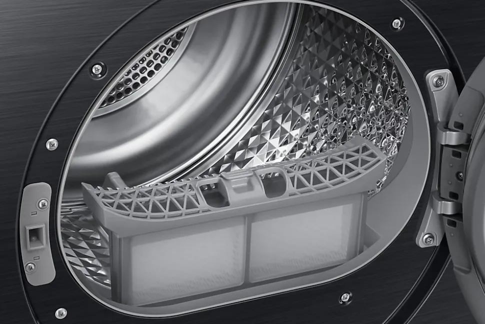 Sèche-linge pompe à chaleur 60cm 9kg noir Samsung – Sèche-linge frontal DV90DG52A0AB de Samsung.Panneau de contrôle simple et intelligent : Grâce à son intelligence artificielle et son interface réduite à l’essentiel, cenouveau panneau de contrôle vous facilite la vie. Programmes les plus utilisés, réglages préférés, description de chaque programme…. Il communique même avec votre lave linge Samsung pour proposer le programme de séchage le plus adapté. Lancez votre sèche-linge d’un simple geste.Optimal Dry : L’arrêt du séchage est automatique grâce au capteur d’humidité, ce qui permet des économies d’énergies et un plus grand soin du linge.Filtre 2-en-1 : Performance et entretien optimisés grâce à un nouveau filtre dans la porte qui capte davantage de fibres textiles. Celui-ci permet de supprimer le filtre du condenseur, pour faciliter l’entretien de l’appareil.SmartThings : Lave-linge compatible avec l’écosystème SmartThings de Samsung. Son assistant Q-Rator simplifie le cycle de lavage grâce à ses fonctionnalités intuitives : Assistant choix programme, Planificateur,Diagnostic utilisation. – Type de produit : Sèche-linge frontal.Capacité nominale (kg) : 9.Capacité linge : 9 kg.Classe énergétique : C.Type de séchage : Pompe à chaleur.Conso. énergie/an (kWh) : 105.Classe taux de condensation : C.Niveau sonore (dB) : 65.Volume tambour (L) : 115.Sèche-linge connecté : Oui.Type de connectivité : SmartThings (Wifi).Optimisation du séchage : Capteur Optimal Dry.Départ différé : Non.Fin différée : Oui.Autre(s) fonction(s) : Anti-pli, Signal sonre On/Off.Ecran : Oui.Affichage du temps restant : Oui.Autre : Indicateur de fin de cycle.Type de moteur : Digital Inverter.Eclairage du tambour : Oui.Porte réversible : Oui.Autre(s) équipement(s) : Filtre 2 en 1, Panier de séchage, Kit évacuation.Sécurité enfants :
