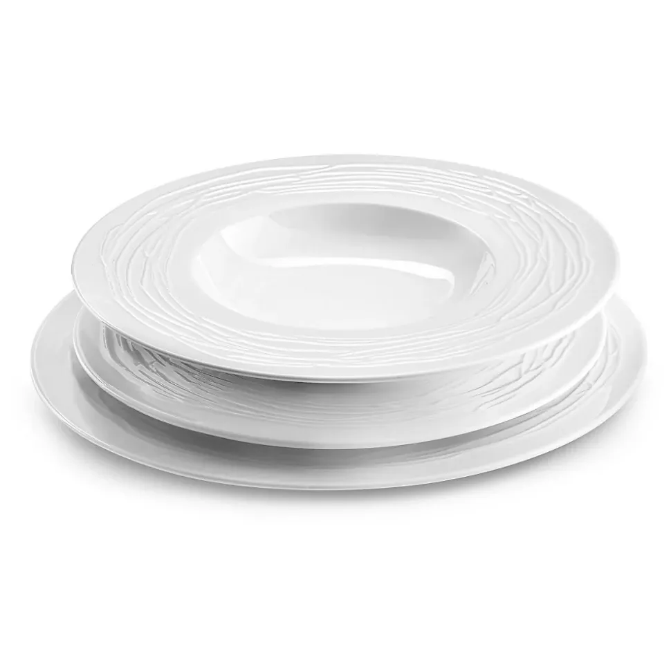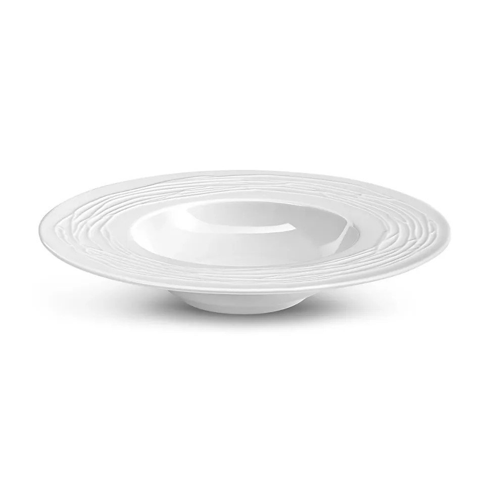 Ensemble de 6 assiettes plates, 6 assiettes dessert et 6 assiettes salade et pâtes de la collection Lago par Médard de Noblat. La collection Lago se distingue par ses lignes irrégulières et en relief qui ornent avec raffinement l’aile large de chaque assiette. Son design subtil et élégant s’intègre parfaitement aux ambiances chic et modernes. Médard de Noblat perpétue un savoir-faire et une tradition de qualité depuis 1836. Notre vaisselle de porcelaines et de grès créé des univers actuels et raffinés, entre rigueur et exubérance, pour un quotidien hors norme. Dimensions Assiette plate 27 cm, assiette dessert 23 cm, assiette salade et pâtes 23 cm