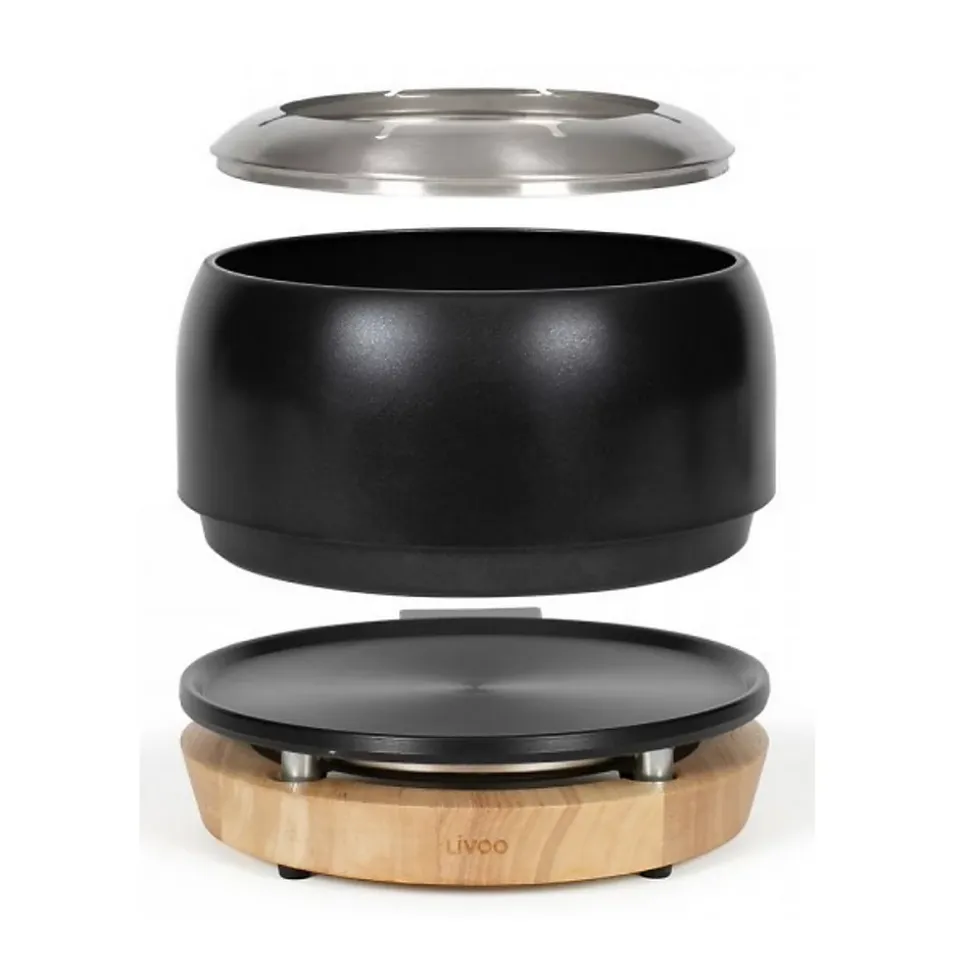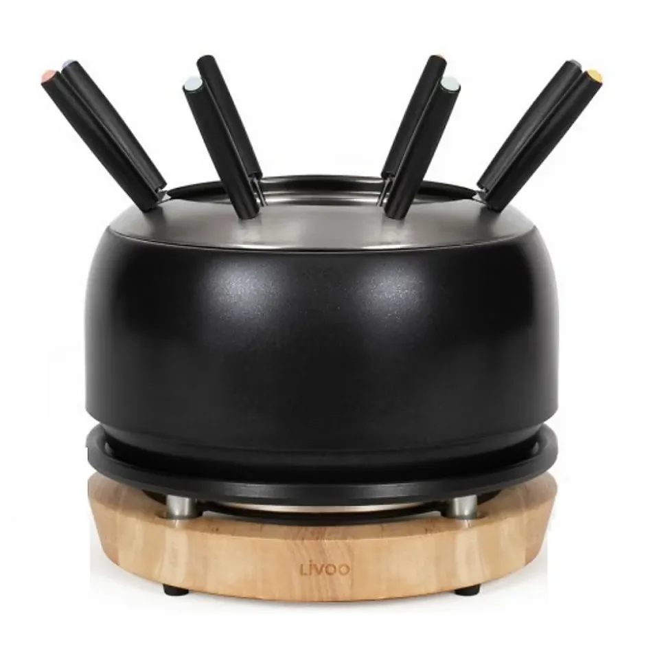 Service à fondue 1200w 8 fourchettes noir Livoo – Service à fondue électrique DOC339 de LivooPuissance de 1200 W et thermostat réglable pour un contrôle parfait de la cuisson selon le type de fondue.Capacité XXL de 2,8 L, idéale pour partager une fondue conviviale jusqu’à 8 personnes.Caquelon à fondue en acier avec revêtement antiadhésif sans PFAS pour une cuisson saine et antiadhésive et un nettoyage facile. – Type de produit : Service à fondue électrique.Prise : Epine ronde.Puissance : 1200 W.Capacité utile : 2.8 L.Capacité caquelon : 3.50 L.Nombre de personnes : 8.Longueur du cordon : 67 cm.Alimentation électrique : Oui.Thermostat réglable.4 pieds antidérapants.Caquelon et fourchettes à fondue lavables au lave-vaisselle.8 fourchettes à fondue et rebord anti-débordement.Support en bois d’hévéa et plaque en aluminium.Révêtement antiadhésif : Oui (sans pfas).% de matière recyclée dans le produit : 5.Couleur : Noir.Dimensions : 25 x 22 x 17.8 cm.Poids : 2 Kg.