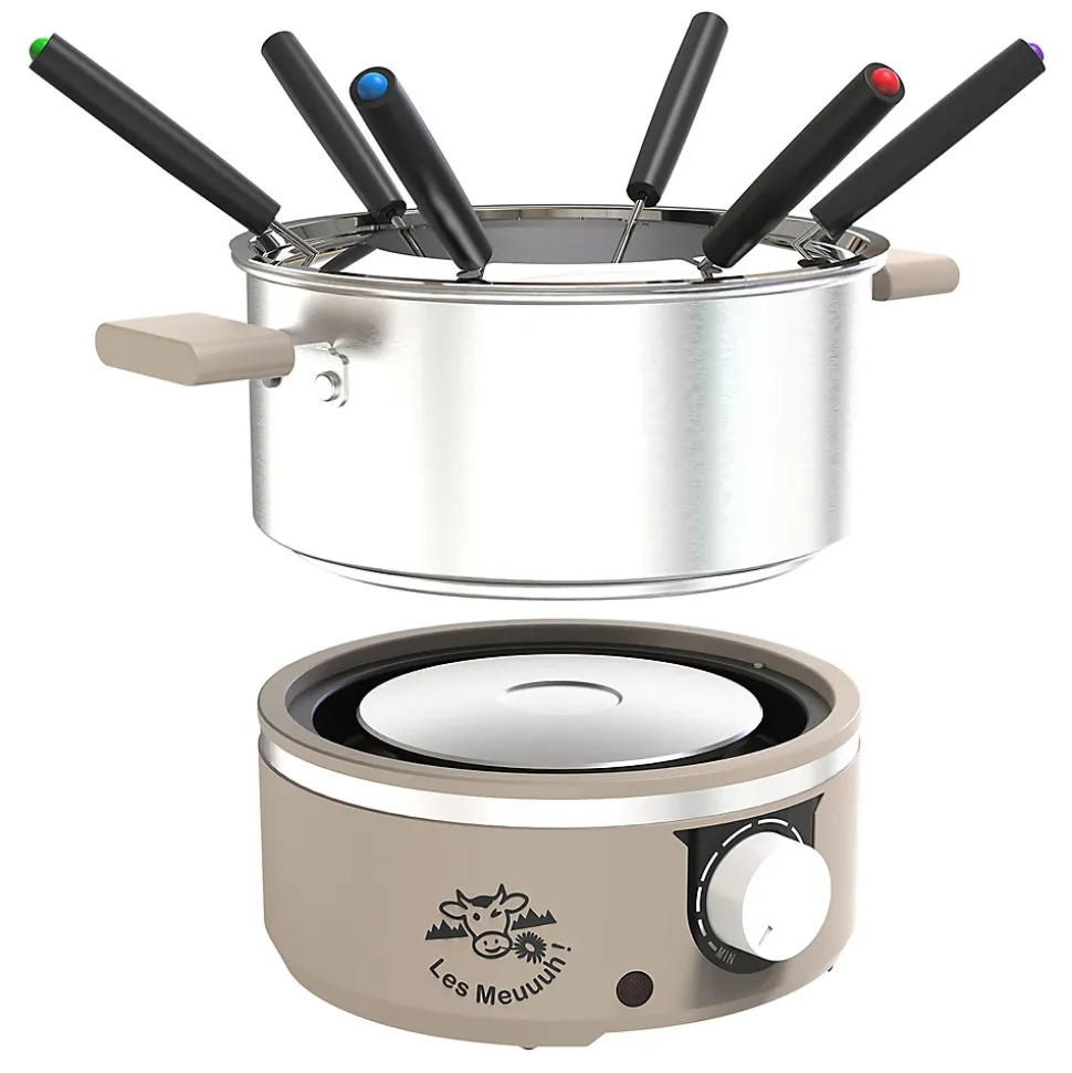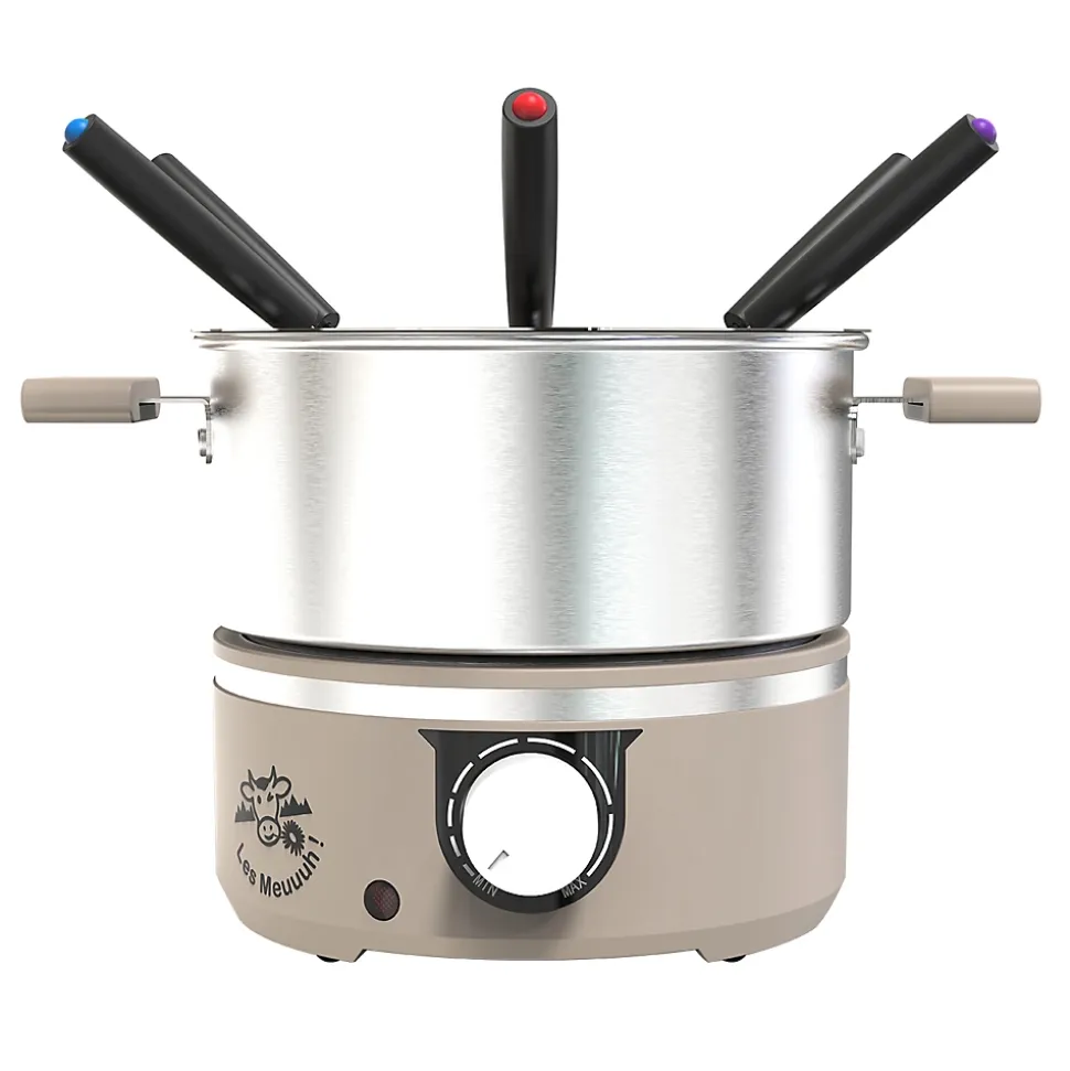 Service à fondue électrique Little Fondue Meuuuh 8964 pour 6 personnes — Pot inox amovible 1,8 L avec revêtement intérieur sans PFAS, 650 W pour un chauffage rapide et uniforme, thermostat réglable, témoin lumineux, résistance amovible et poignées froides pour une manipulation sûre. Compatible induction, livré avec 6 fourchettes colorées et couronne en inox pour maintenir les fourchettes.
