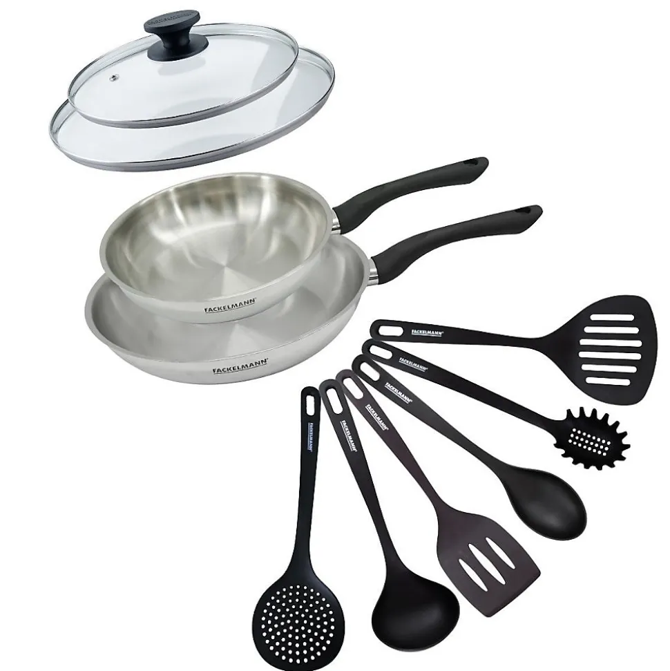 - DESCRIPTION: Set Fackelmann Geneva de poêles inox 18/8 de 24 cm et 28 cm, couvercles en verre assortis, et 6ustensiles pour une cuisine saine et pratique pour 2 à 5 personnes