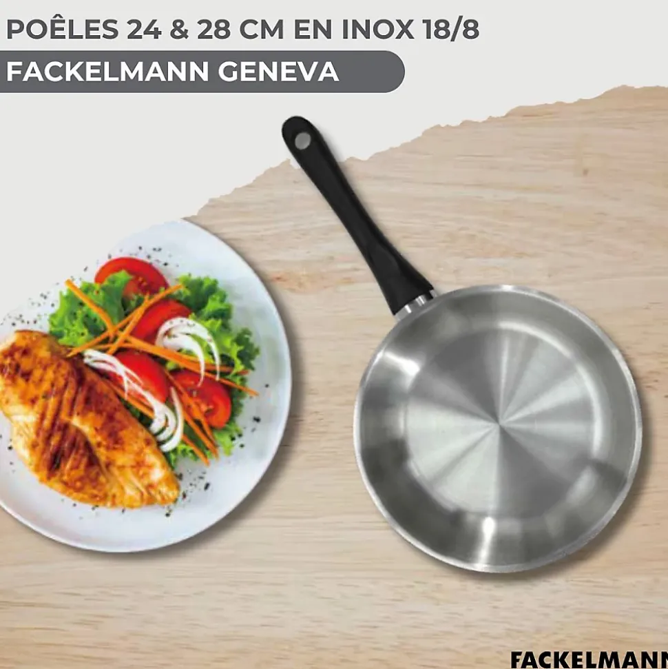 DESCRIPTION: Set Fackelmann Geneva de poêles inox 18/8 de 24 cm et 28 cm, couvercles en verre assortis, et 6ustensiles pour une cuisine saine et pratique pour 2 à 5 personnesPETIT +: La combinaison poêle et couvercle permet de surveiller vos plats sans ouvrir, pour réserver leur saveur et économiser l’énergieCOMPOSITION: Poêles de cuisson en acier inoxydable 18/8, couvercles en verre et inox, ustensiles en RPETDIMENSIONS: Poêle 24 cm Hauteur 6 cm Fond 18,1 cm Manche 19 cm ; Poêle 28 cm Hauteur 6 cm Fond 20 cm Manche 19 cm ; Couvercles 24 et 28 cm ; Ustensiles de 29,5 à 31,5 cmUTILISATION: Parfait pour tous types de feux, y compris induction, et pour une utilisation au four jusqu’à 150°CENTRETIEN: Ustensiles et poêle compatibles lave-vaisselle, culottage nécessaire avant la première utilisationLes poêles à frire Fackelmann Geneva en acier inoxydable 18/8 assurent une cuisson saine et uniforme. Polyvalentes, elle sont compatibles avec tous les types de feux, y compris induction, et résistantes au four jusqu’à 150°C.Leur manche ergonomique en bakélite assure une prise en main confortable. Excellente conductivité thermique et résistance aux rayures. Passent au lave-vaisselle comme les ustensiles.Les couvercles en verre transparents sont dotés d’un système de ventilation. Ils permettent de réaliser des économies d’énergie, et de surveiller la cuisson sans ouvrir, tout en préservant chaleur et humidité. A laver à la main.En complément, vous trouverez une louche, une pelle à servir, une pelle à servir ajourée, une écumoire, une cuillère à spaghetti et une cuillère à servir en RPET noir résistant jusqu’à 210°C.Les poêles nécessitent un culottage avant la première utilisation pour une performance optimale.Induction : le diamètre du fond du récipient doit est égal au diamètre de la zone de cuisson, sinon la plaque peut ne pas le reconnaître.