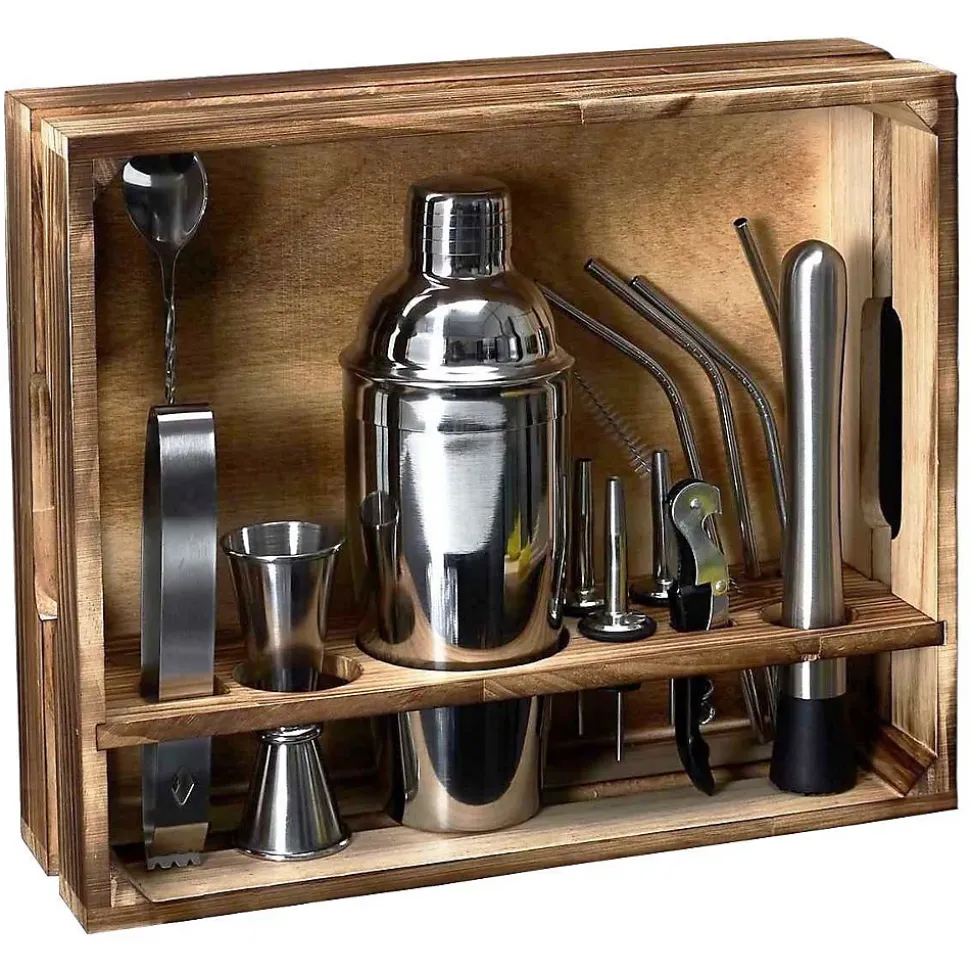 Aspect : Matériau principal = Acier Inoxydable • Matériaux secondaires = Pin ABS (plastique) • Dimensions : Hauteur (en cm) = 15 • Longueur (en cm) = 27,40 • Profondeur (en cm) = 14,50 • Autres caractéristiques : Poids (en kg) = 1,15 • Set cocktail 15 accessoires avec support cagette Lounge