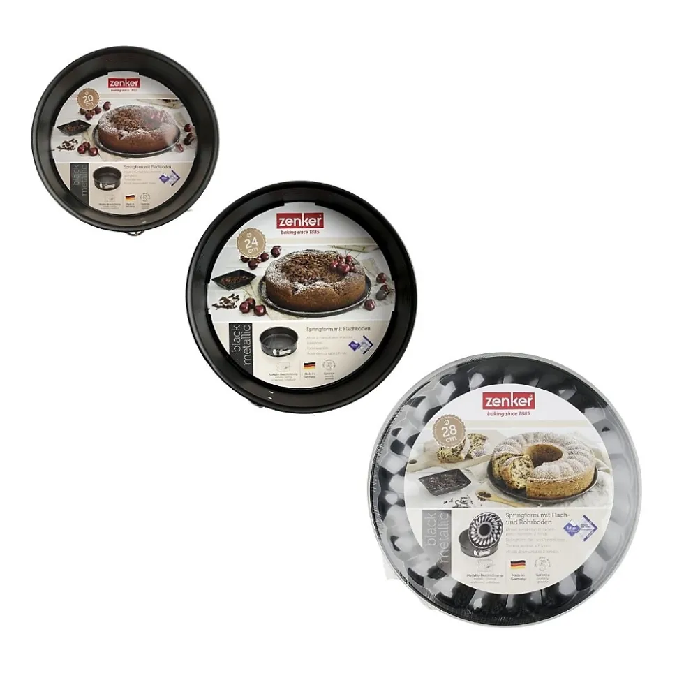 - DESCRIPTION : Zenker vous propose ce set de 3 moules à gâteaux : 2 moules à charnières simples de 20 et 24 cm de diamètres et 1 moule à manqué avec fond pour savarin de 28 cm de diamètre.