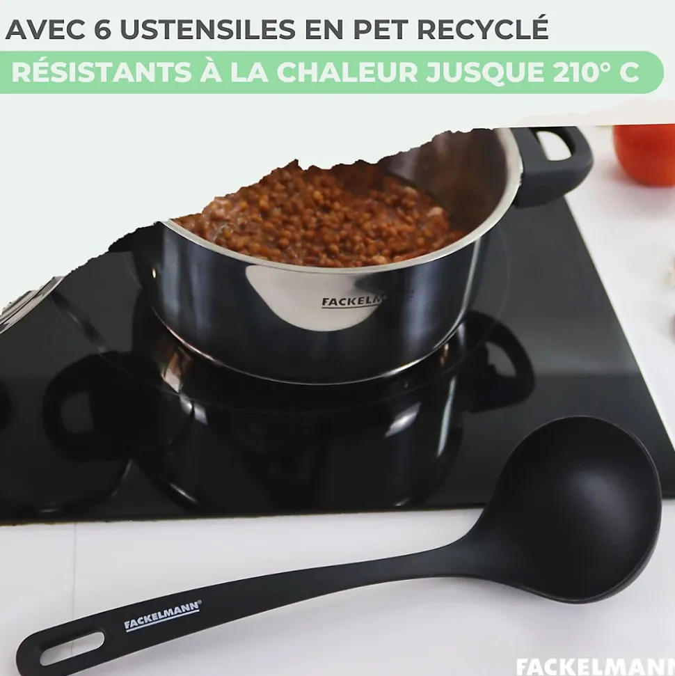 - DESCRIPTION: Batterie Fackelmann Brandao avec 2 poêles 20 et 24 cm, 3 casseroles de 16 à 20 cm en aluminium recyclé avec revêtement céramique antiadhésif, et 6 ustensiles en RPET noir