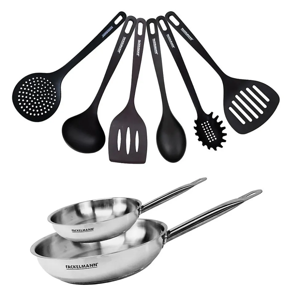 DESCRIPTION: Set de 2 poêles de 20 et 28 cm en inox 18/8 et six ustensiles de cuisine et de service en RPETPETIT +: Cet ensemble vous offre tout le nécessaire pour préparer et le servir vos plats pour 1 à 5 personnesCOMPOSITION: Poêles en inox 18/8 ; ustensiles en plastique recyclé, un matériau léger et résistant jusqu’à 210°CDIMENSIONS: Poêle 20 cm Hauteur 4,5 cm Fond 14,5 cm Manche 16,5 cm ; Poêle 28 cm Hauteur 5,5 cm Fond 20 cm Manche 19 cm ; ustensiles de 29,5 à 31,5 cm de longUTILISATION: Poêles adaptées à tous types de feux, y compris induction, et passe au four jusqu’à 200°C ; ustensiles adaptés pour la cuisson et le serviceENTRETIEN: Poêles nécessitent un culottage, et passent au lave-vaisselle comme les ustensiles pour un nettoyage simplifiéCette batterie de cuisine de haute qualité Fackelmann Eterna comprend une poêle de 20 cm idéale pour 1 à 2 personnes, et une de 28 cm parfaite pour 4 à 5 convives.Compatibles avec tous les types de feux, y compris induction et four jusqu’à 200°C, les poêles sont conçues pour résister aux rayures et à la corrosion.Ces poêles à frire en inox 18/8 sans PFAS avec un noyau en aluminium léger assurent une cuisson saine, une excellente conduction thermique et une répartition homogène de la chaleur. Le manche tube en inox riveté offre une prise en main solide et sécurisée.Ajoutez à cela une louche, une pelle, une cuillère, une écumoire et une cuillère à spaghetti en plastique recyclé noir, pratiques et résistants, pour servir vos plats favoris.Un ensemble qui allie qualité, fonctionnalité et style. Les poêles de cuisson sont compatibles avec le lave-vaisselle.Elles nécessitent un culottage avant la première utilisation pour une performance optimale.Induction : le diamètre du fond du récipient doit est égal au diamètre de la zone de cuisson, sinon la plaque peut ne pas le reconnaître.