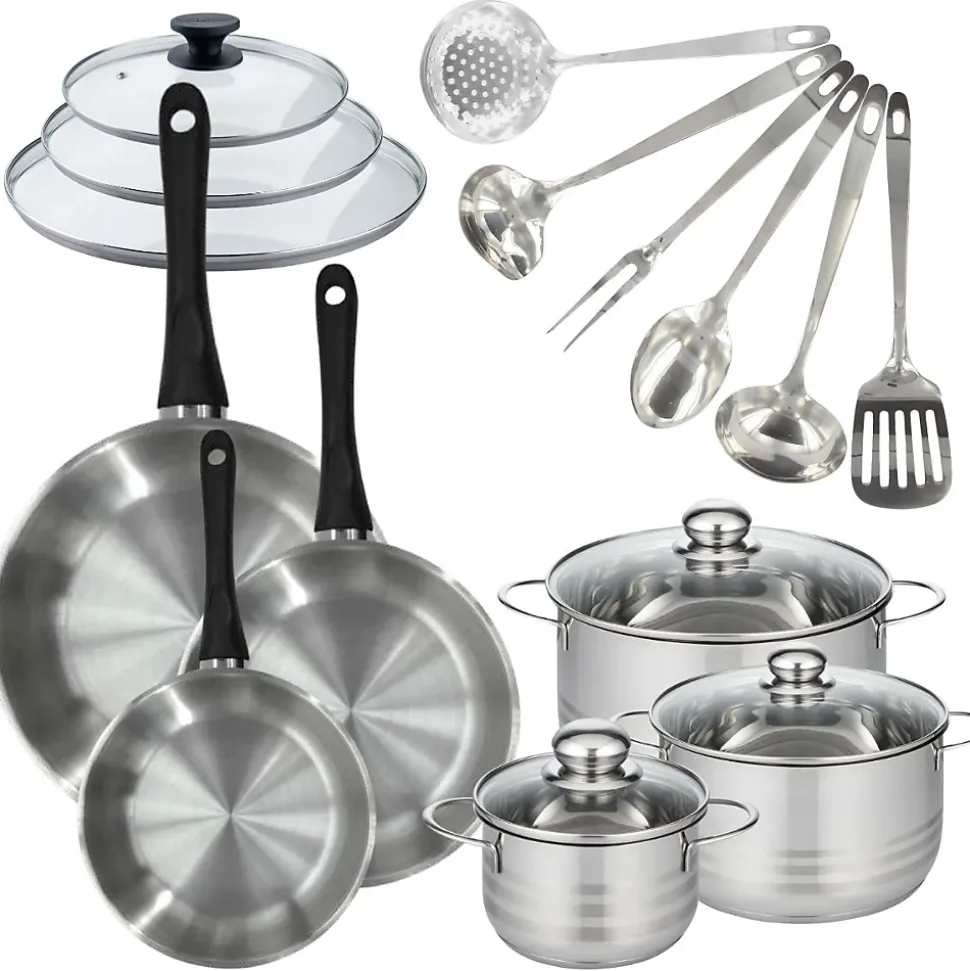 - DESCRIPTION: Set Fackelmann Geneva de 3 poêles de 20, 24 et 28 cm en inox 18/8 et couvercles, 3 faitouts inox de 16 cm, 20 cm et 24 cm et 6 ustensiles