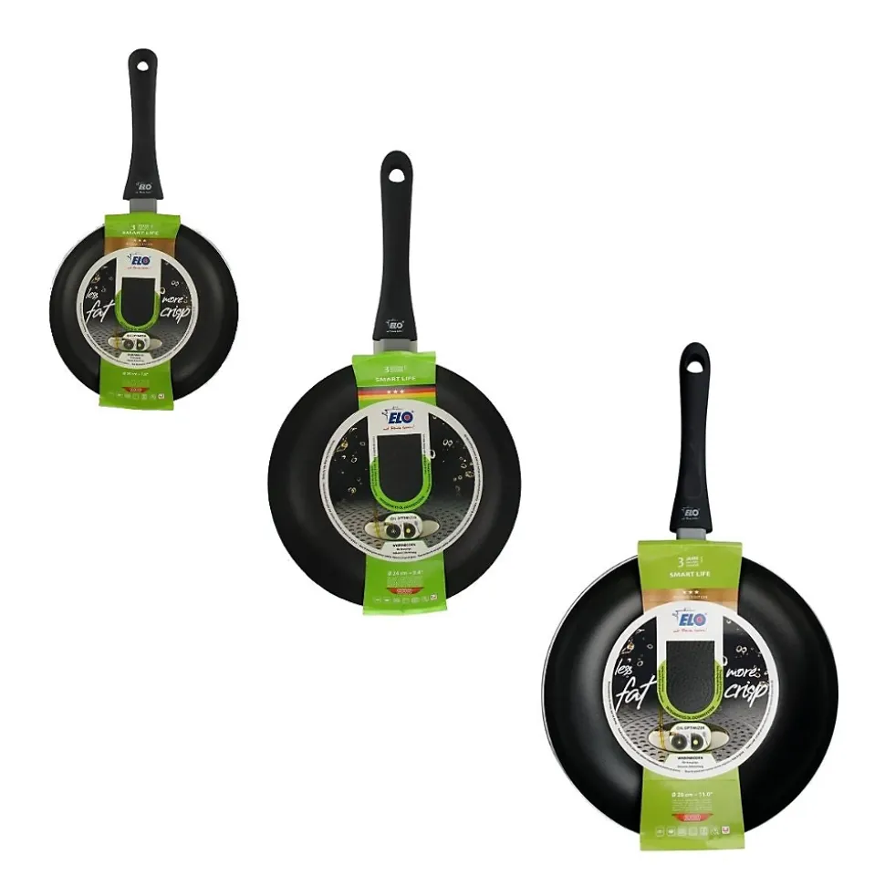 - DESCRIPTION : Elo vous propose ce set de 3 poêles à frire de 20, 24 et 28 cm de diamètre parfaites pour faire revenir votre viande ou votre portion de légumes sans surplus de matière grasse grâce à son revêtement anti-adhérant et son fond en nid d’abeille