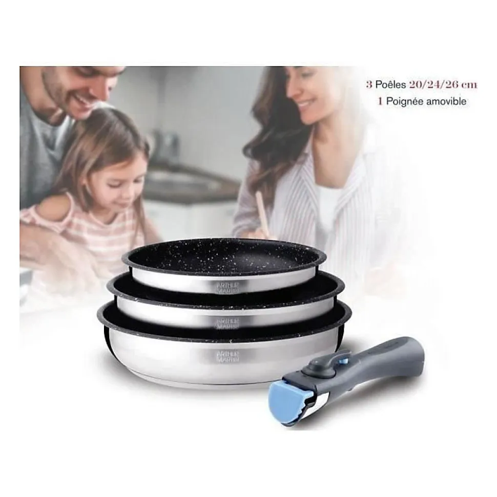 Le set de 3 poêles Arthur Martin AM2196 est conçu en acier inoxydable avec intérieur anti-adhérent et poignée amovible. Compatible tous feux, dont induction, il offre robustesse, durabilité et facilité d’utilisation pour les cuisiniers exigeants.