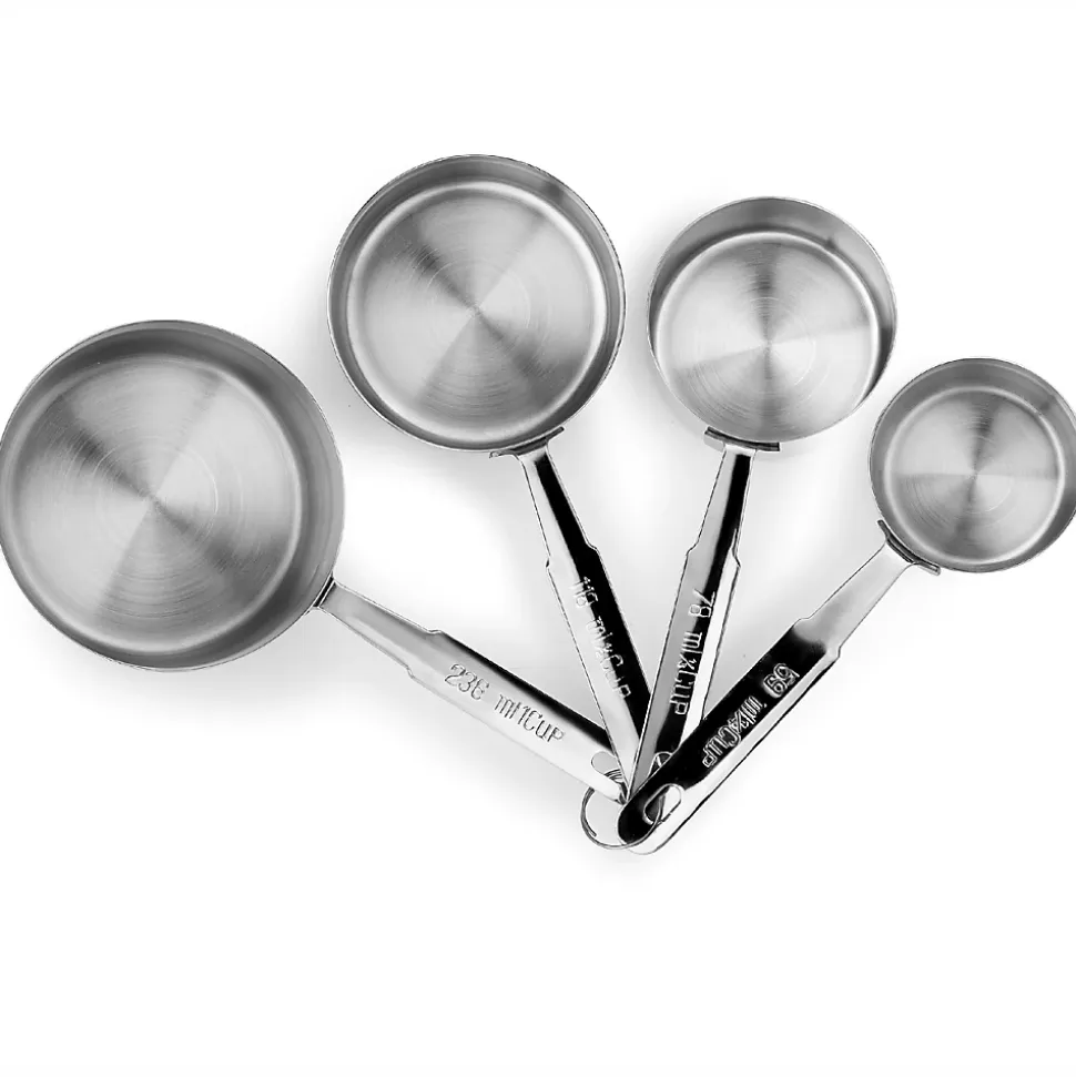 Set de 4 cuillères en inox Set de 4 cuillères mesureur en acier inoxydable reliées ensemble par un anneau et parfaites pour un dosage rapide en cuisine.Capacité : 59 ml – 78 ml – 118 ml – 236 ml