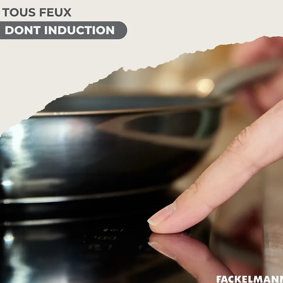 DESCRIPTION: Set Fackelmann Geneva comprenant une poêle en inox de 24 cm, son couvercle en verre et 6 ustensiles en RPET, parfaits pour cuisiner et servir pour 2 à 3 personnesPETIT +: L’association de la poêle et du couvercle optimise la cuisson et permet de surveiller vos plats tout en préservant leur saveurCOMPOSITION: Poêle en acier inoxydable 18/8, couvercle en verre, ustensiles en plastique recyclé, robustes et résistantsDIMENSIONS: Poêle 24 cm Hauteur 6 cm Fond 18,1 cm Manche 19 cm ; Couvercle 24 cm ; Ustensiles de 29,5 à 31,5 cmUTILISATION: Parfait pour tous types de cuisson, y compris induction et four jusqu’à 150°C, pour servir avec élégance vos plats faits maisonLa poêle à frire en acier inoxydable 18/8 sans PFAS garantit une cuisine saine et pratique. Polyvalente, elle est compatible avec tous les types de feux, y compris induction, et résiste au four jusqu’à 150°C.Cette poêle de cuisson offre une excellente conductivité thermique et une excellent résistance aux rayures et à la corrosion. Design robuste et élégant ; son manche ergonomique en bakélite assure une prise en main confortable. Passe au lave-vaisselle comme les ustensiles.Le couvercle en verre transparent, doté d’un système de ventilation, permet de surveiller la cuisson sans ouvrir, tout en préservant chaleur et humidité. A laver à la main.En complément, vous trouverez une louche, une pelle à servir, une pelle à servir ajourée, une écumoire, une cuillère à spaghetti et une cuillère à servir en RPET noir résistant jusqu’à 210°C.La poêle nécessite un culottage avant la première utilisation pour une performance optimale.Induction : le diamètre du fond du récipient doit est égal au diamètre de la zone de cuisson, sinon la plaque peut ne pas le reconnaître.