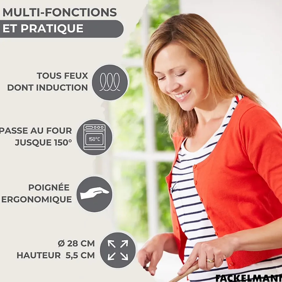 DESCRIPTION: Ensemble Fackelmann Geneva comprenant une poêle de 28 cm en inox 18/8, un couvercle en verre et 6 ustensiles en inox pour une cuisine saine et pratiquePETIT +: Ce set complet allie des produits essentiels et de haute qualité, pour préparer et servir facilement vos plats pour 4 à 5 personnes, et garantit une cuisson saineCOMPOSITION: Poêle en acier inoxydable 18/8 résistant aux rayures et à la corrosion ; couvercle en verre cerclé inox 18/10, ustensiles en inoxDIMENSIONS: Poêle 28 cm Hauteur 6 cm Fond 20 cm Manche 19 cm ; Couvercle 28 cm ; ustensiles de 28 à 32 cmUTILISATION: Idéal pour cuisiner sur tous types de feux, dont induction et four jusqu’à 150°C, et servir vos plats en toute simplicitéLa poêle à frire en acier inoxydable 18/8 sans PFAS est idéale pour une cuisine saine et pratique. Elle est compatible avec tous les types de feux, y compris induction, et résistante au four jusqu’à 150°C.Cette poêle de cuisson offre une conductivité thermique et une résistance aux rayures et à la corrosion optimales. Manche ergonomique en bakélite pour une prise en main confortable. Passe au lave-vaisselle.Le couvercle en verre transparent, doté d’un système de ventilation, permet de surveiller la cuisson sans ouvrir, tout en préservant chaleur et humidité. Laver à la main.Les 6 ustensiles de cuisson et de service sont robustes, en acier inoxydable : louche, louche ovale, cuillère de service, écumoire, fourchette à viande, pelle de service robustes. Lavage à la main recommandé.La poêle nécessite un culottage avant la première utilisation pour une performance optimale.Induction : le diamètre du fond du récipient doit est égal au diamètre de la zone de cuisson, sinon la plaque peut ne pas le reconnaître.