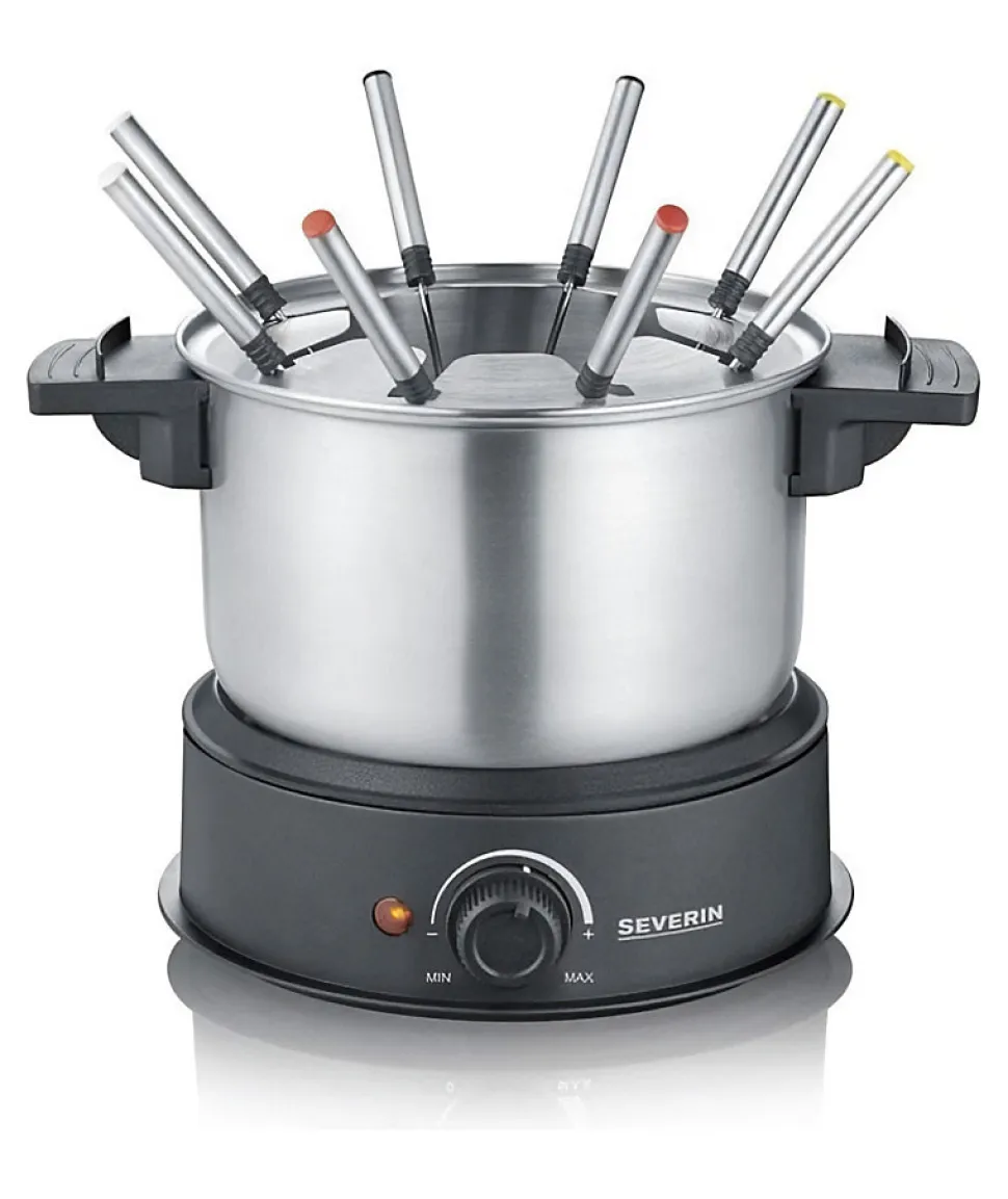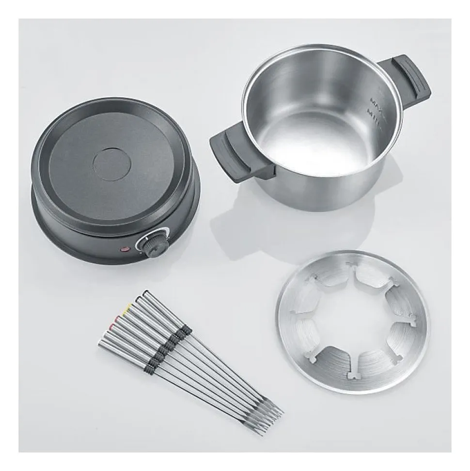 Fondue électrique pour 8 personnes pour fondues savoyardes, bourguignonnes, chinoises, au chocolat selon vos envies – Caquelon inox amovible, lavable au lave-vaisselle – Capacité : 1,4 L – Protection anti-projections avec fixations pour les fourchettes – Socle en matiere plastique résistant a la chaleur – Poignées isolantes – Thermostat réglable avec sécurité contre la surchauffe – câble d’alimentation d’1 metre