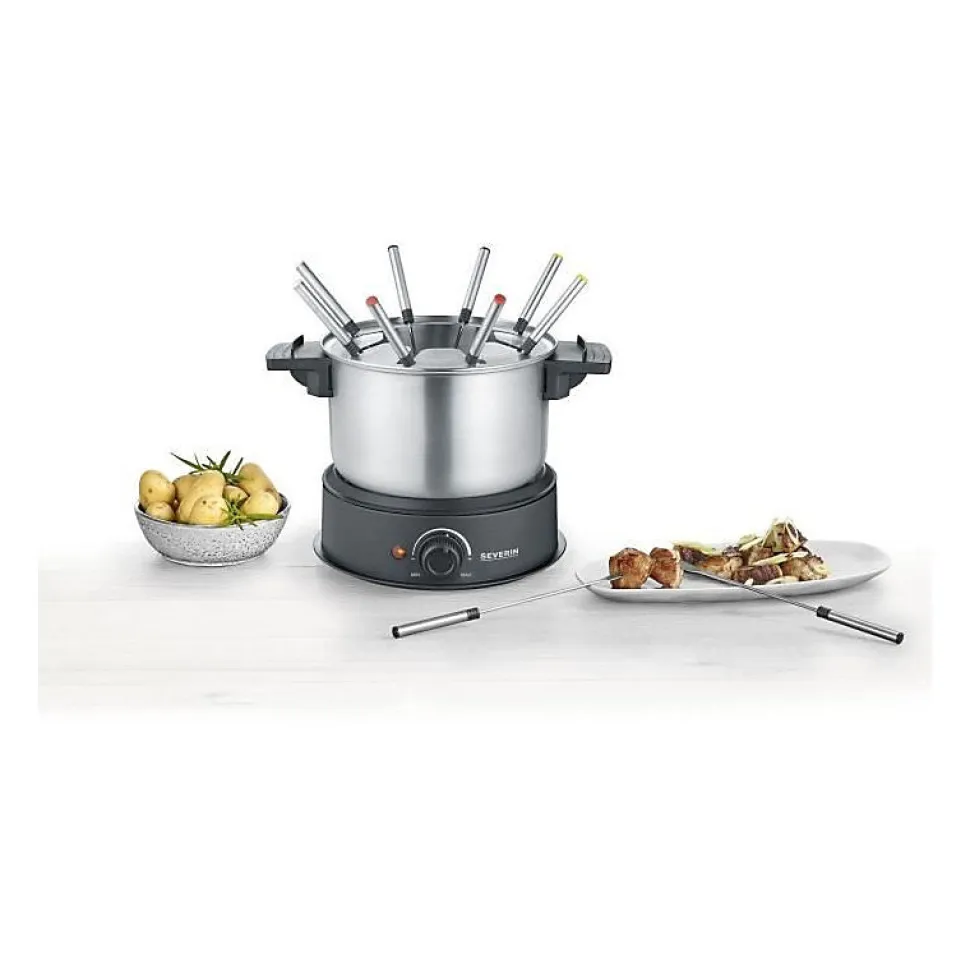 Fondue électrique pour 8 personnes avec caquelon inox amovible, protection anti-projections, 8 fourchettes colorées, puissance 1500 watts, capacité 1,4 litre, thermostat réglable avec sécurité contre la surchauffe, socle en plastique résistant à la chaleur, poignées isolantes, câble alimentation 1 mètre.