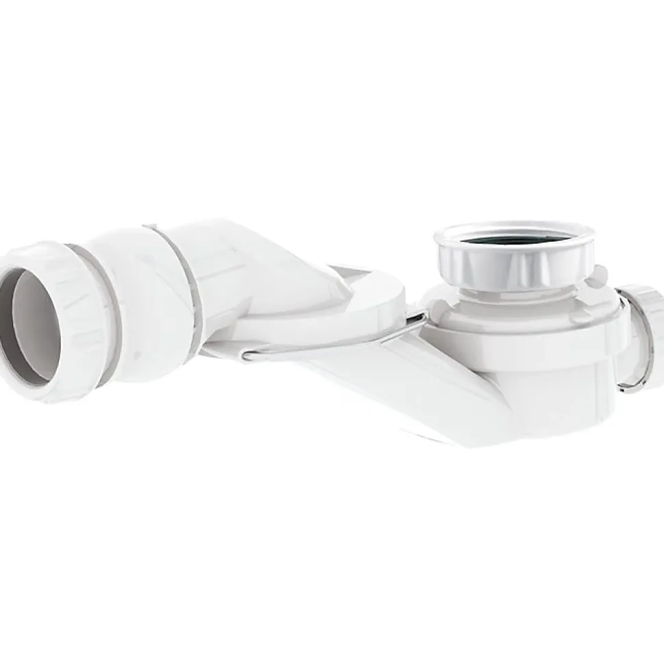 Siphon de faible encombrement à très grand débit Entrée 1 »1/2 Sortie orientable Ø 40 Encombrement 95 mm Garde d’eau 50 mm Débit : 70 l/min sous 300 mm d’eau Polypropylène
