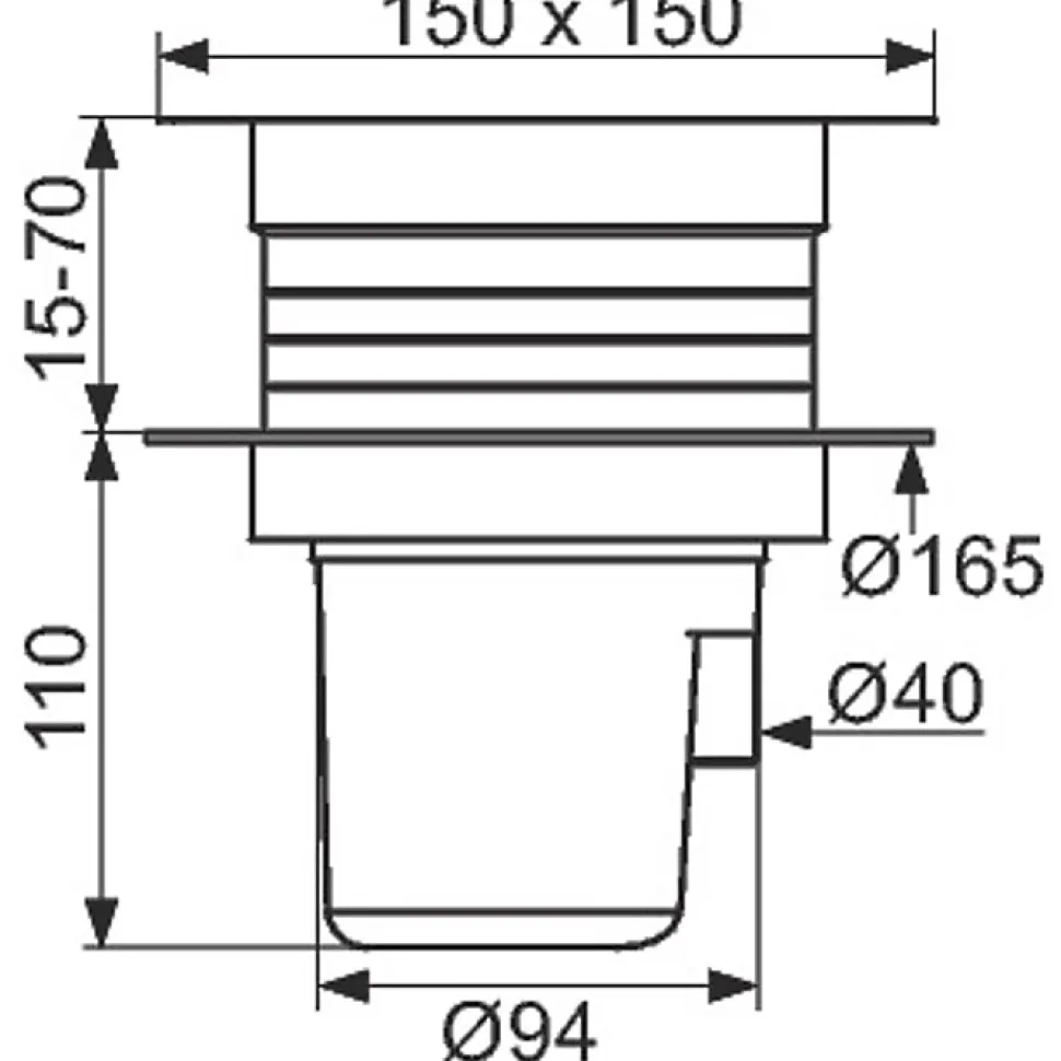 Sortie horizontale ou verticale Ø 40 intégrée dans la hauteur du corps PVC Classé antifeu (suivant norme américaine UL94) Grille fixée par 2 vis Inox 150×150 – hauteur réglable jusqu’à 70mm avec réhausse Prévoir un coude PVC pour sortie horizontale