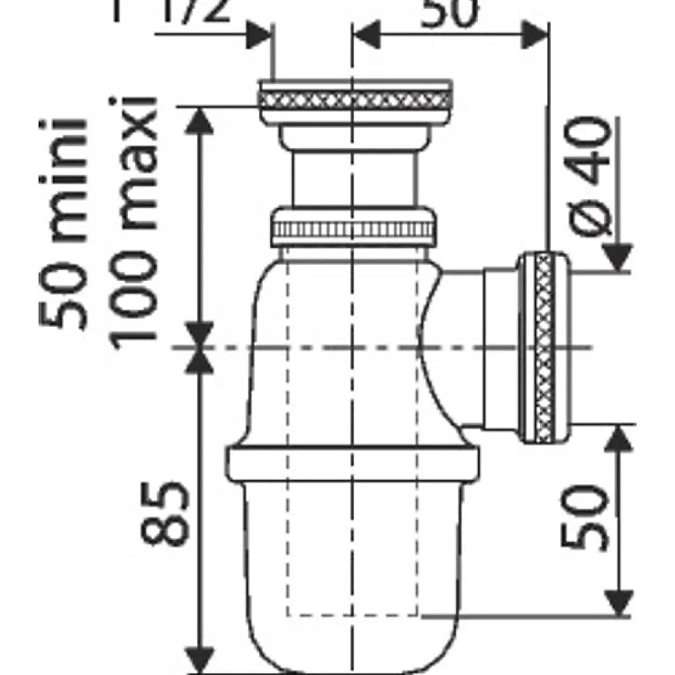 Hauteur réglable : ± 50 mm Arrivée écrou 1 »1/2 Sortie écrou 1’1/2 avec joint Pour tube Ø 40 mm