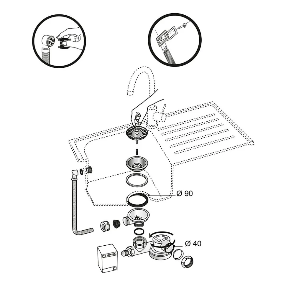 Siphon extra-plat réglable blanc 90mm avec bouchon et trop-plein Wirquin