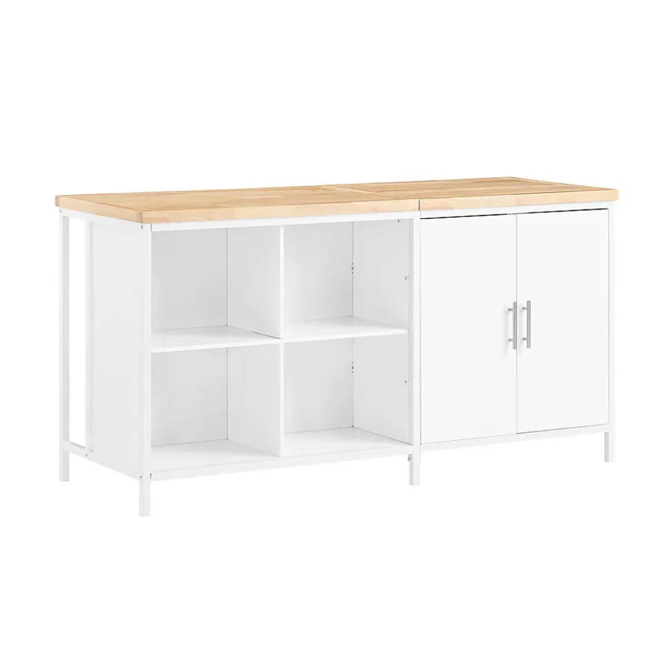 Îlot central de cuisine avec plan de travail en bois d’hévéa, desserte avec 2 portes et 4 compartiments, 170x60x89 cm, blanc Ce meuble polyvalent allie fonctionnalité et esthétique. Son plan de travail spacieux offre une surface de préparation et de repas pratique. Structure semi-ouverte avec rangements pour ustensiles et affichage d’articles. Doté de 2 portes et 4 compartiments modulables, il optimise l’espace pour le rangement de vaisselle. Les étagères derrière les portes sont réglables sur 3 hauteurs ou amovibles. Caractéristiques : Matériaux : MDF, PB et bois d’hévéa Dimensions : 170 x 60 x 89 cm Poids : 58 kg Charge maximale : 92 kg