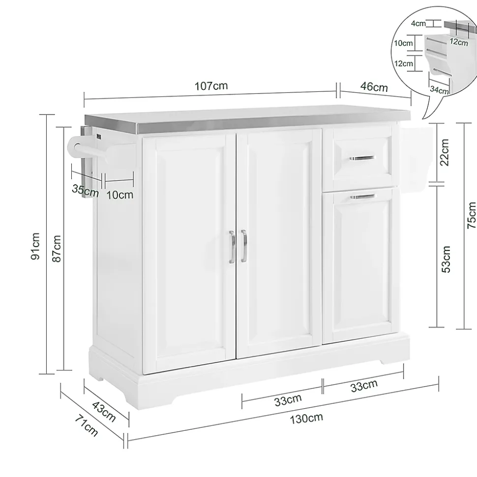 Cet îlot de cuisine moderne sur roulettes est fabriqué en PB et MDF, avec un plan de travail en acier inoxydable. Dimensions : 130 x 46-71 x 91 cm. Capacité de charge : 90 kg. Espace de rangement optimisé : 2 tiroirs, une armoire avec étagère réglable et une boîte de rangement pour accessoires culinaires. Équipé d’un porte-serviettes et d’un porte-couteaux à 3 crochets Plan de travail extensible : Le côté rabattable prolonge la surface de 25 cm (de 46 à 71 cm), offrant un espace supplémentaire pour la préparation des repas Mobilité pratique : 4 roues intégrées permettant de déplacer facilement l’îlot selon les besoins Option de tiroir extractible : Permet de ranger une poubelle ou des équipements volumineux comme un mixeur Idéal pour les cuisines compactes, alliant fonctionnalité et esthétique.