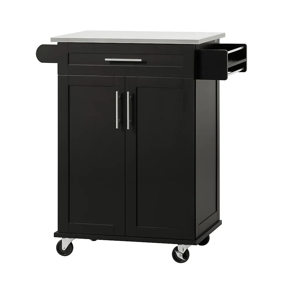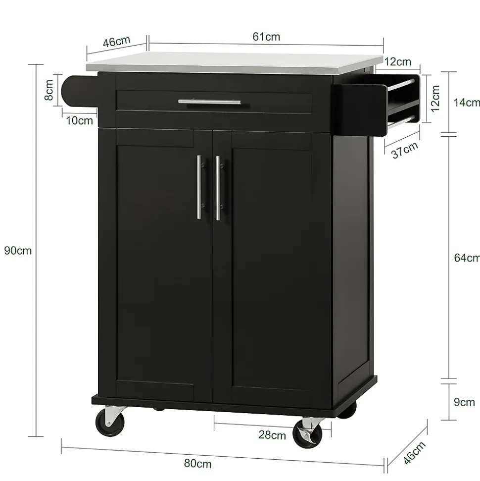 Ajoutez une touche contemporaine dans votre cuisine ce chariot de rangement. Il vous offre de grand espace de rangement pour divers ustensiles dans la cuisine, à la salle a manger, etc. Equipé d’un grand plan de travail en inox, 1 tiroirs, 1 porte-serviette, 1 cahche étagère à épices sur le côté et 1 étagères de rangement réglables en hauteur. Toutes les 4 roulettes pivotent en plastique fonctionnent bien et silencieusement. Deux d’entre elles sont équipées d’un frein. Conception et fabrication en bois de pin et bois MDF classe E1. Dimension(LxHxP): 83 x 46 x 90 cm. Plan de travail : 46 x 61 cm. Capacité de charge jusqu’à 50 kg. Avec la Facture.