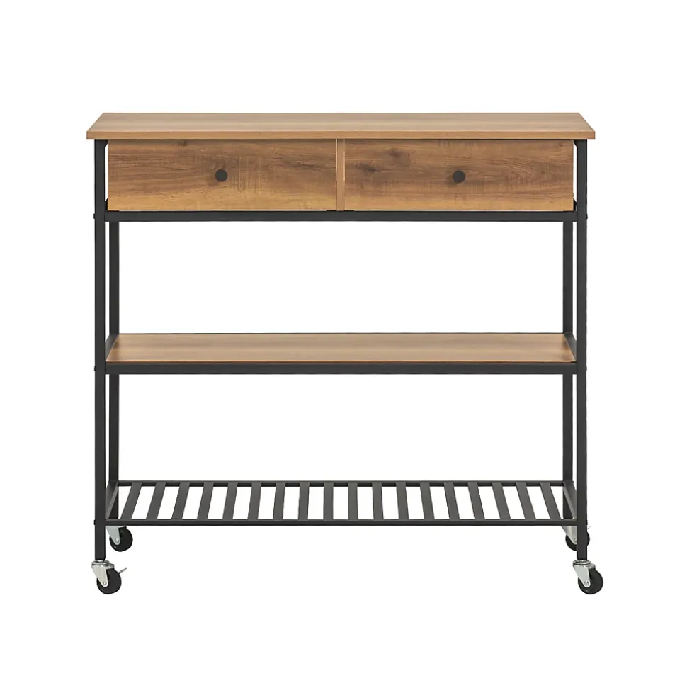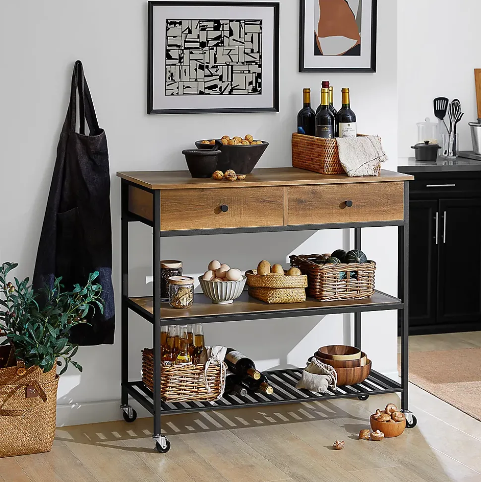 Ajoutez une touche industrielle dans votre cuisine ce chariot de rangement.Il vous offre de grand espace de rangement pour divers ustensiles dans la cuisine, à la salle à manger, etc.Desserte de cuisine en bois avec plan de travail supérieur. Le bois résistant se fond dans tous les intérieurs et donne un air agréable.Les deux étages de rangement sont parfaits pour vos épices, plats, pots ou autres dont vous avez souvent besoin, pour ranger les ustensiles rapidement accessibles.Les deux tiroirs permettent de ranger vos couverts et fournitures de cuisine.Grâce aux 4 roulettes pivotent en plastique (deux sont blocables) bien fonctionne beaucoup de mobilité et possibilité de placer le meuble n’importe où.Matériaux : panneaux de particules classe E1 et métal.Dimension(LxPxH) : 100x45x93cm.Capacité de charge jusqu’à 60 kg.Vous pouvez également combiner ce desserte roulante avec chariot de cuisine <a href= »https://www.sobuy.fr/products/sobuy%C2%AE-fkw111-pf-desserte-roulante-chariot-de-cuisine-meuble-de-rangement-a-roulettes-chariot-de-service?_pos=1&_sid=9c0f92e13&_ss=r » title= »FKW111-PF » style= »font-size:
