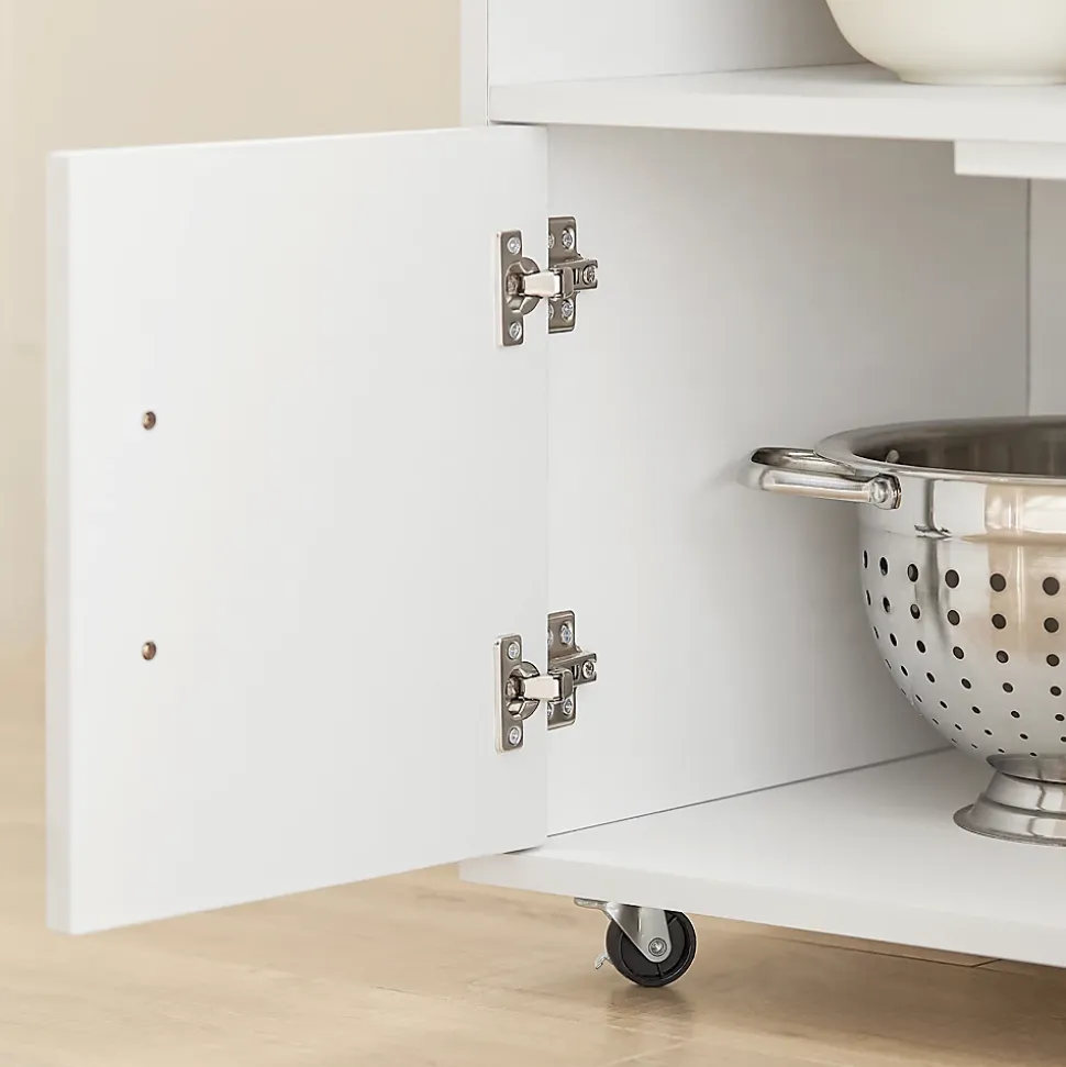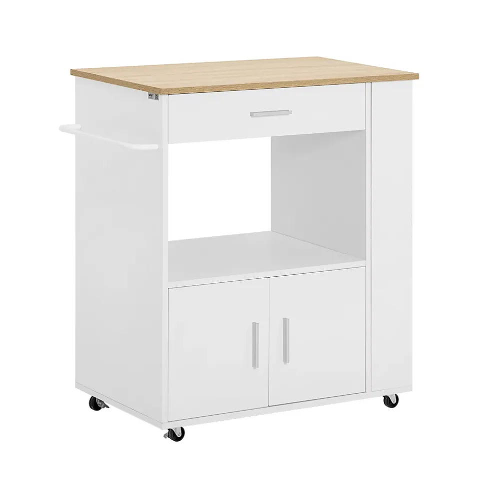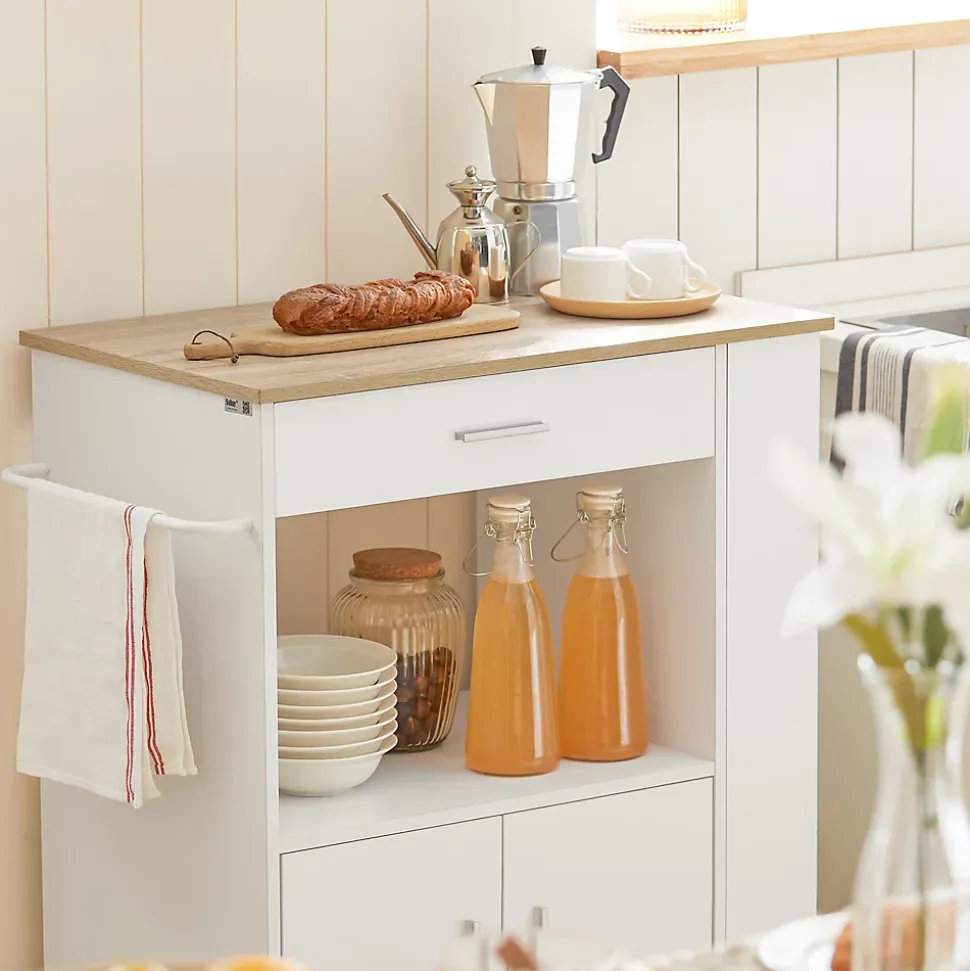 Le design classique de ce chariot s’adapte parfaitement à l’intérieur. vous pourrez l’utiliser au quotidien ou vous en aurez besoin : cuisine, salon, cellier ou cave. Ce meuble de cuisine bénéficie de nombreux espaces de rangement dont 1 tiroir, 1 cache étagère à épices sur le côté et 2 portes. Avec les 3 étagères latérales et un porte-essuie-tout, vous pouvez placer des boissons, des vins, des tasses, des serviettes, etc. La barre de chaque étagère peuvent empêcher des choses de tomber par terre. Vous pouvez stocker et présenter vos vins fins. En plus, vous avez toujours les bouteilles et les verres ensemble et vous n’avez pas besoin de les stocker séparément. Quatre roulettes pivotent multidirectionnelles et deux d’entre elles sont équipées d’un frein parking. Détails: – Matière : fabriqué panneau de copeaux et MDF. – Dimensions : L82 x P46 x H88 cm. – Poids de l’envoi : 29 kg. – Capacité de charge statique maximale : 75 kg – Installation facile avec la notice de montage illustrée.