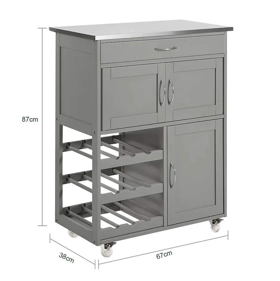 Cette moderne desserte de cuisine à roulettes est super pratique pour ranger vos verres de vin, bouteilles, ustensiles de cuisine, etc.1 grand tiroir pour des ustensiles de cuisine et 2 compartiments avec portes pour des vaisselles, bols, assiettes, etc. 3 porte-bouteilles jusqu’à 9 bouteilles.Matériaux de qualité, en bois MDF(E1), Plateau en Acier INOX.Dimensions: L67cmxH87cmxP38cm.Dimensions du plan de travail : L67cmxP38cm. Capacité de charge: 60kg.Trois couleurs aux choix: FKW45-WN(blanc) / FKW45-SCH(noir) / FKW45-HG(gris). <ul class= »a-un