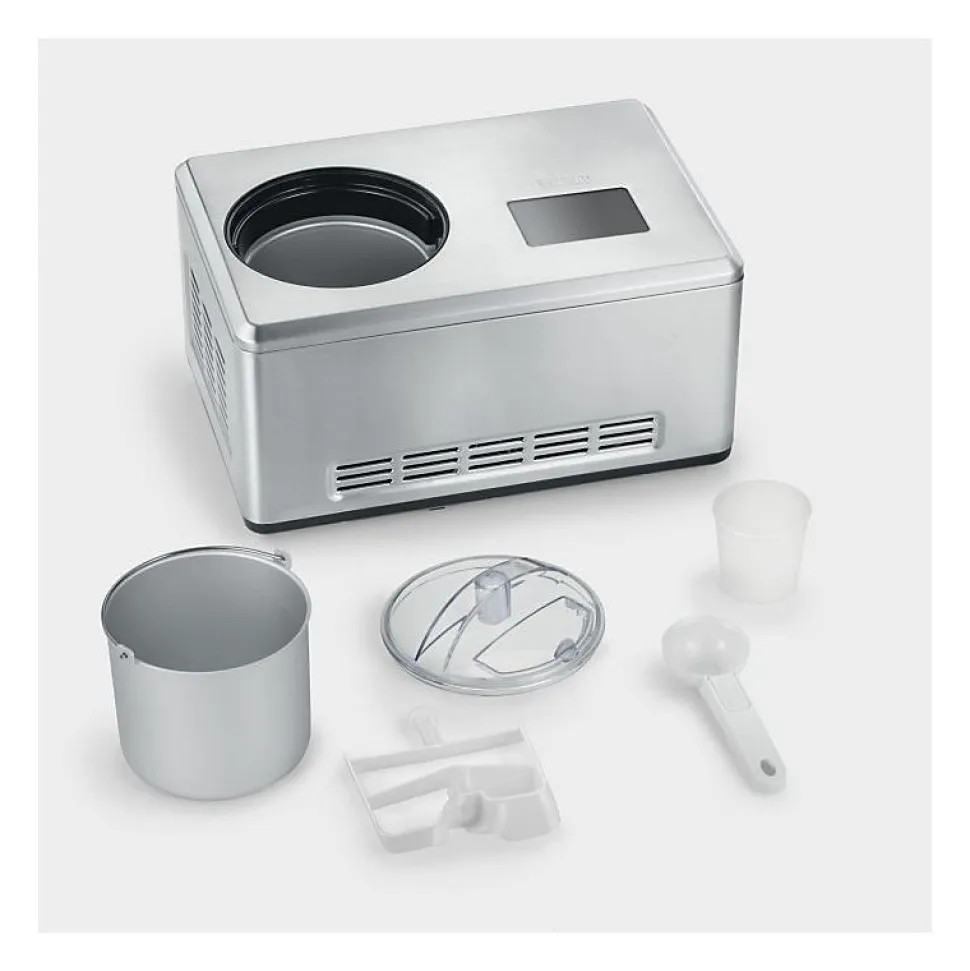 Sorbetière Severin EZ7406 polyvalente avec fonction yaourtière, compresseur pour refroidissement actif sans pré-refroidissement, écran tactile et minuterie intégrée. Inclut accessoires et livre de recettes.