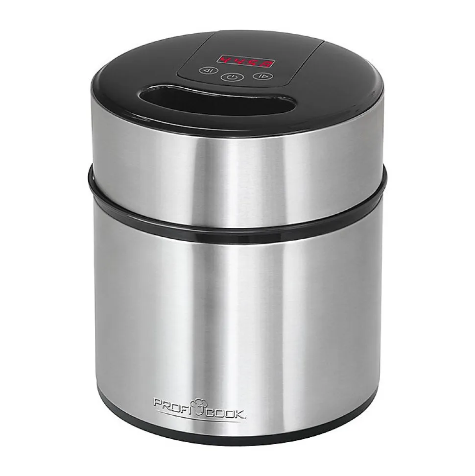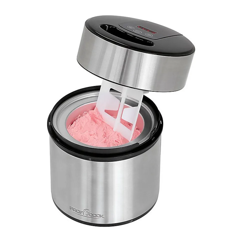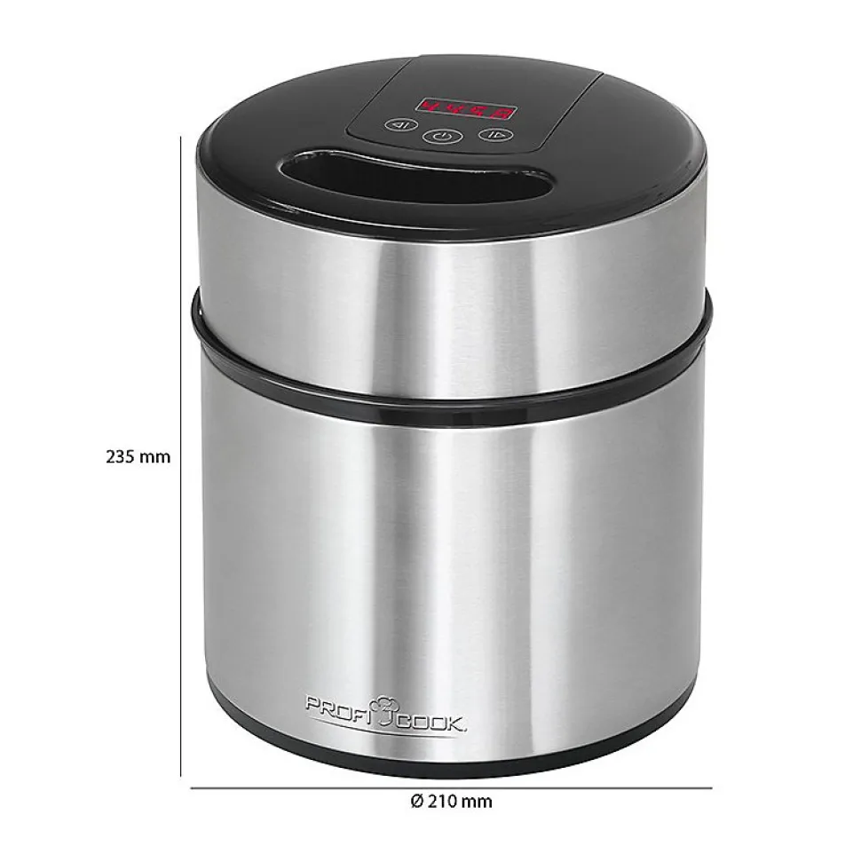 – Sorbetière pour la préparation de la crème glacée, du yaourt glacé et du sorbet- Boîtier en acier inoxydable- Affichage LED- Minuterie numérique avec arrêt automatique- Réglage de la durée variable (5-45 min.)- Temps de préparation (crème glacée): 20-45 min.- Panneau de commande tactile à capteur électronique- Couvercle avec ouverture de remplissage- Incl. suggestions de recettes- Pour jusqu’à 1800 ml de glace- Sorbetière à double paroi avec chambre froide, amovible pour un nettoyage facile (H: 14,3 cm; Ø 19,2 cm)- Élément d’agitation avec moteur puissant et silencieux- Haute stabilité grâce aux pieds caoutchoutés- 220-240 V, 50 Hz, 12 W