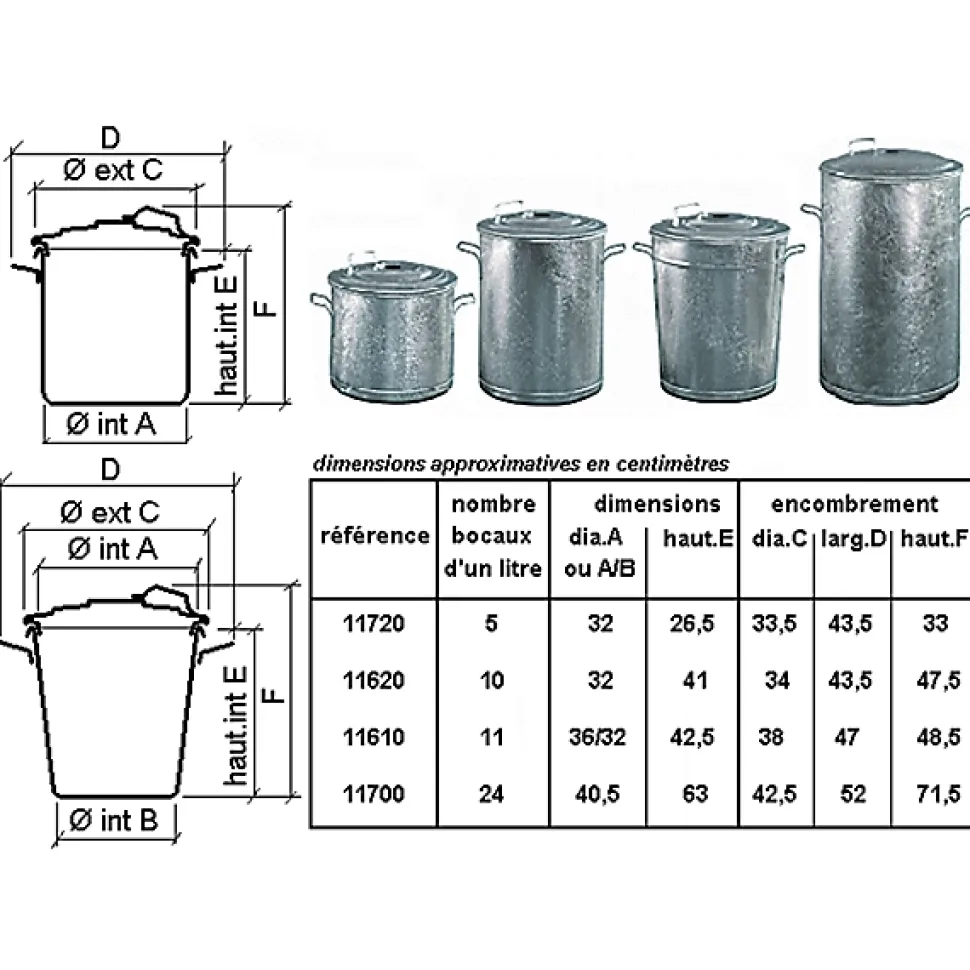 Stérilisateur de bocaux en acier galvanisé capacité 11 bocaux de 1l Guillouard – Le bouilleur, sur le principe du bain marie et grâce à une colonne centrale amovible et des ressorts maintenant les bocaux pendant l’ébullition, permet de faire ses propres conserves.Parmi les bouilleurs de différentes dimensions ce modèle tronconique a été développé pour faciliter l’empilage en magasin ou chez le particulier.Sa contenance convient le plus souvent aux adeptes de la conservation. – StérilisateurEn acier galvanisé à chaudPour 11 bocaux de 1 L