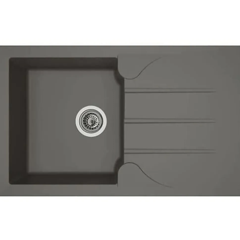 Évier de cuisine STRADOUR Aloa en résine gris béton, résistant à la chaleur, avec 1 bac rectangulaire et égouttoir réversible, vidage manuel Ø90 mm inclus, bord d’encastrement plat et découpes décoratives entre bac et égouttoir ; fabriqué en France et certifié EN13310 & EN 695, garanti 2 ans.