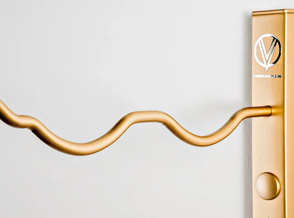 Support à bouteilles de vin VintageView en métal doré double profondeur. La série W2 est un support à bouteilles de vin mural de 6 bouteilles de haut qui transforme n’importe quel mur, aussi petit soit-il, en design moderne de présentations de bouteilles de vin. Hauteur de 61, Profondeur 22 et largeur de 33cm avec la bouteille.