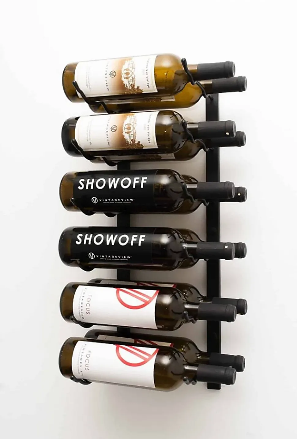 Support à bouteilles de vin VintageView en métal noir double profondeur. La série W2 est un support à bouteilles de vin mural de 6 bouteilles de haut qui transforme n’importe quel mur, aussi petit soit-il, en design moderne de présentations de bouteilles de vin. Hauteur de 61, Profondeur 22 et largeur de 33cm avec la bouteille.