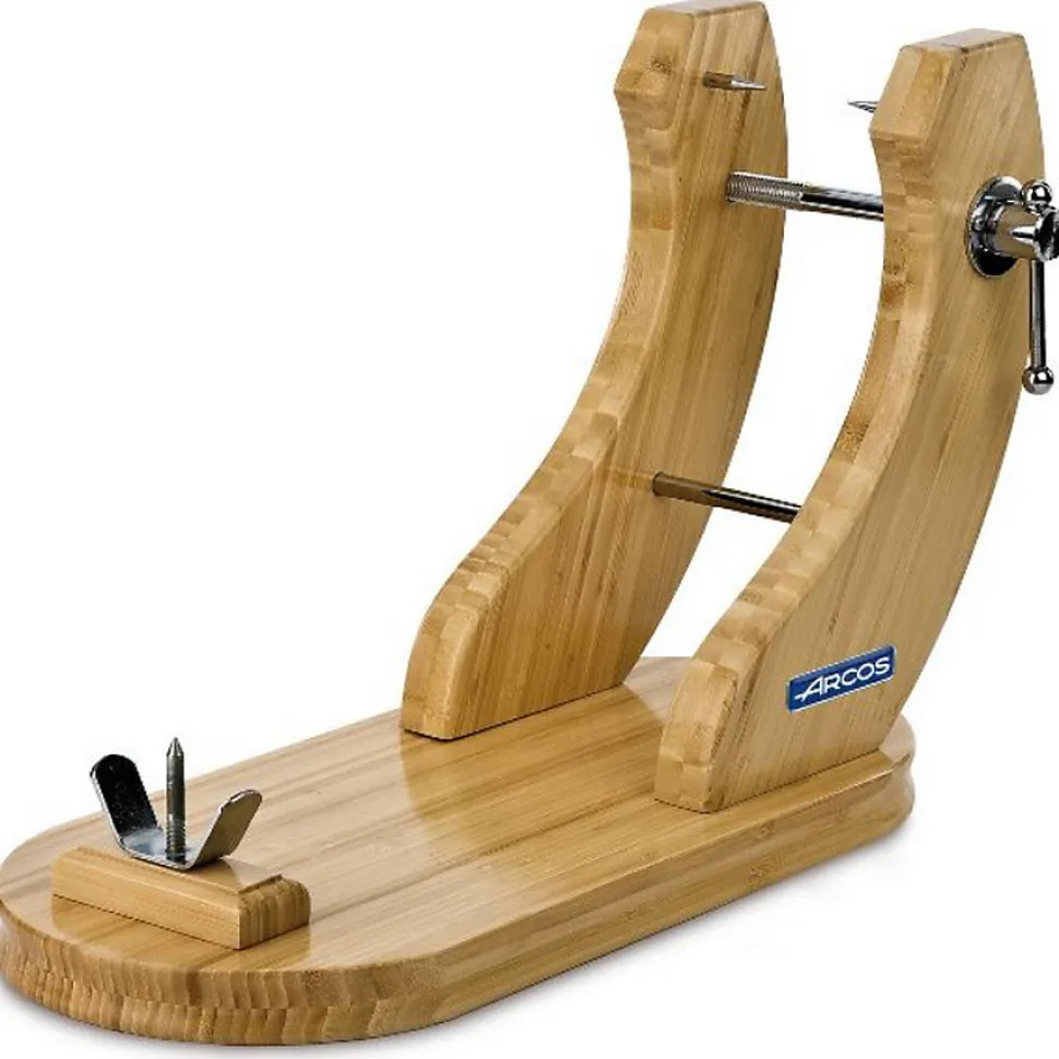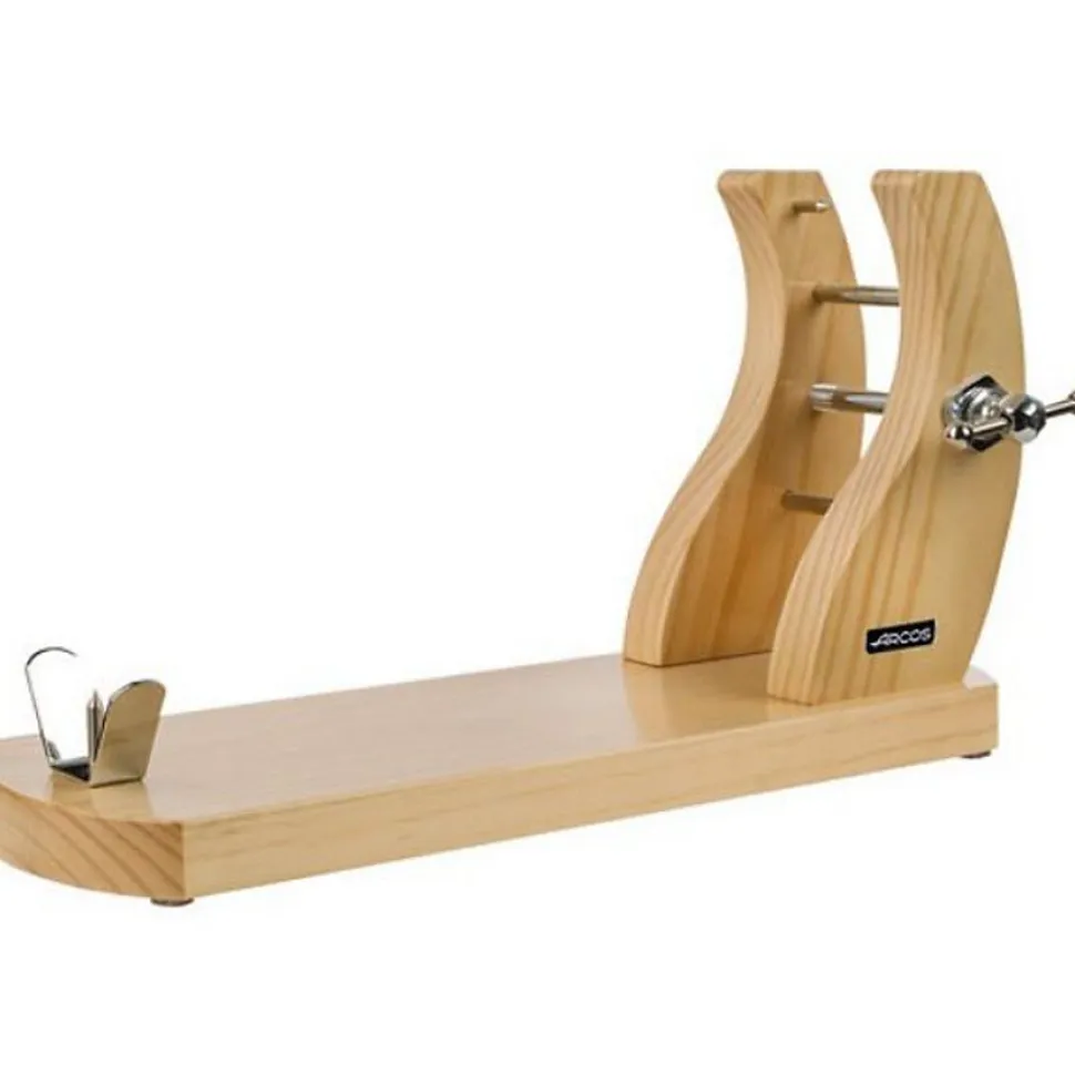 Support à jambon en pin Arcos – Le support à jambon en pin Arcos 683300 est idéal pour les amateurs du jambon sec entier fraîchement découpé ! Ce support vous permettra de stocker votre jambon, de le présenter à vos convives et de le découper facilement en tranches. Système de maintien du jambon pour une découpe sûre et efficace. En bois de pin laqué couleur naturel. – Type de produit : Support à jambon.Matière : Bois de pin laqué.Couleur : Naturel.Dimensions 50 x 18.06 x 28 cm.Poids 5.5 kg.