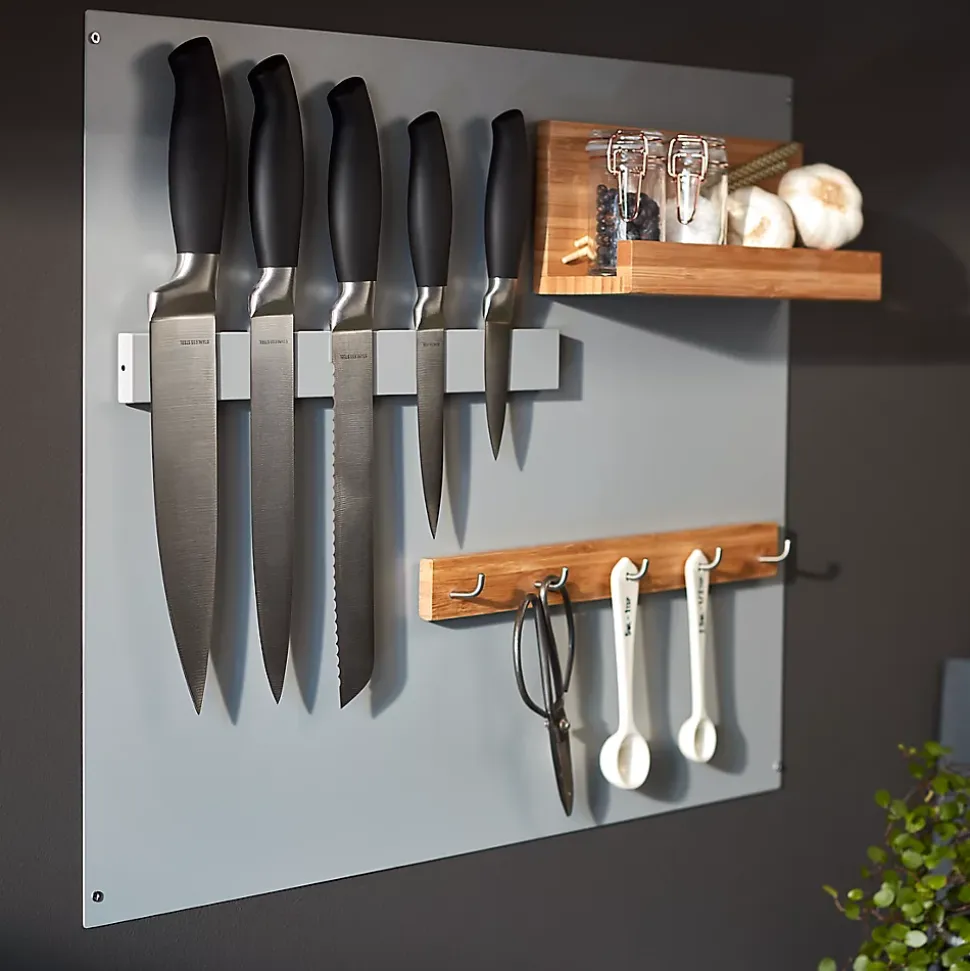 Personne n’aime fouiller dans le tiroir à couvert en essayant de trouver le bon ustensile. Ce tableau magnétique vous permet d’exposer les ustensiles que vous utilisez le plus pour qu’ils soient à portée de main quand vous en avez besoin. Installez-le entre votre plan de travail et vos meubles hauts et ajoutez des accessoires Pecel pour conserver ce dont vous avez besoin à portée de main