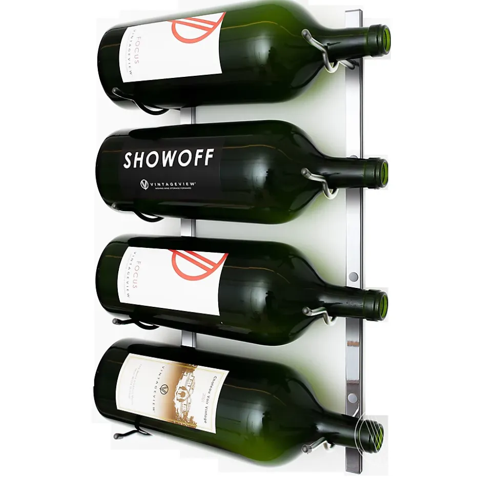 Le support à grandes bouteilles de la série W est un support à bouteilles de vin mural de 4 grandes bouteilles pouvant contenir jusqu’à 6 litres de vin. Idéal pour ceux qui désirent stocker ou présenter des doubles magnum, jéroboams et impérials. 76,2 x45,7 x20,3 cm avec les bouteilles de vin rangées. Peut contenir 4 grandes bouteilles (3L, 4.5L, ou 6L), étiquette en avant. Finition chromée.