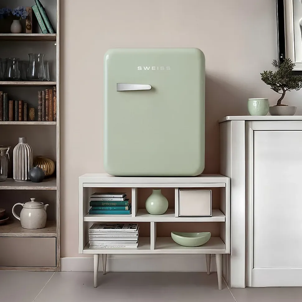 Le mini bar au design vintage WEISS a tout pour vous plaire ! Grâce à son format ultra compacte, il s’adapte à tous vos espaces. D’une capacité de 31 L, ce mini bar comprend une clayette et 2 compartiments de rangement dans la porte. Grâce à son thermostat réglable, ajustez la température à vos besoins, entre 6 et 15°C. Son design retro fait de lui un immanquable pour votre intérieur. Sa poignée chromée et des bords arrondis lui donnent un style élégant. Chez vous, dans une chambre d’hôtel ou au bureau, gardez toujours vos boissons au frais avec la gamme WEISS !CARACTÉRISTIQUES :Capacité : 31 L Hauteur : 54 cm Design vintage Capacité de refroidissement : 6 – 15℃ Thermostat réglable Pieds réglables Niveau sonore : 24dB Compact Accessoire : poignée Classe énergétique : E Puissance : 58W