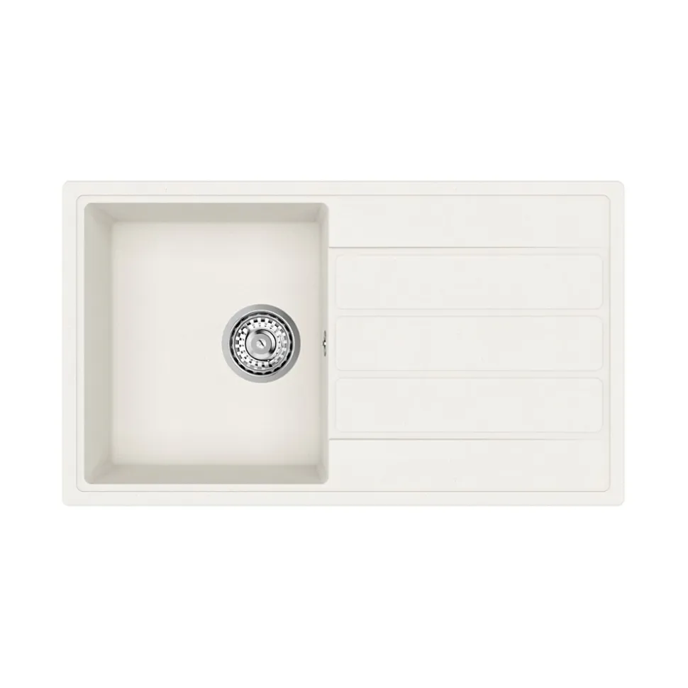 Caractéristiques de l’Evier 76×44 cm avec égouttoir réversible en Granite, à encastrer, Blanc (SATSINKGE3W) :Coloris : BlancMatière : Granite Sous-meuble : 45 cm Dimensions de l’évier : 76×44 cmDimensions de la découpe : 74×42 cm Dimensions de la cuve : 38x33x17 cmEgouttoir réversible 2 trous pour robinetterie pré-percésTrop plein inclus Bonde, siphon, accessoires de montage compris;