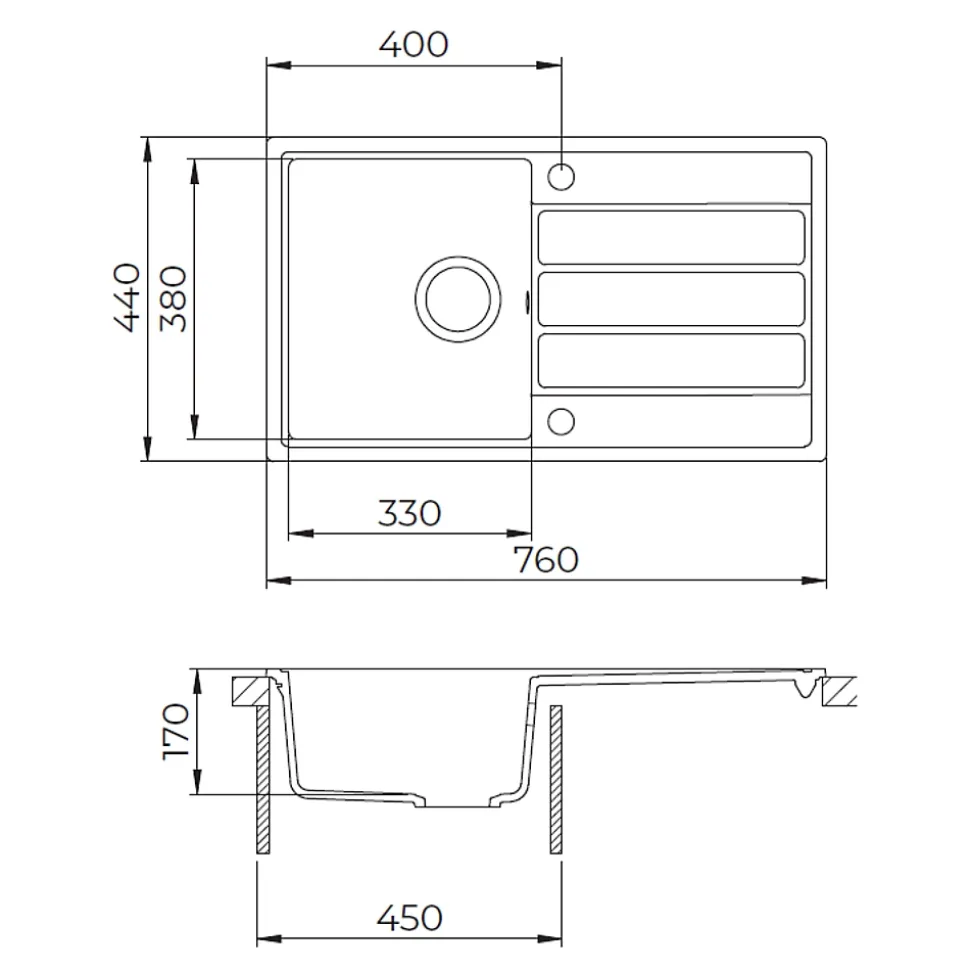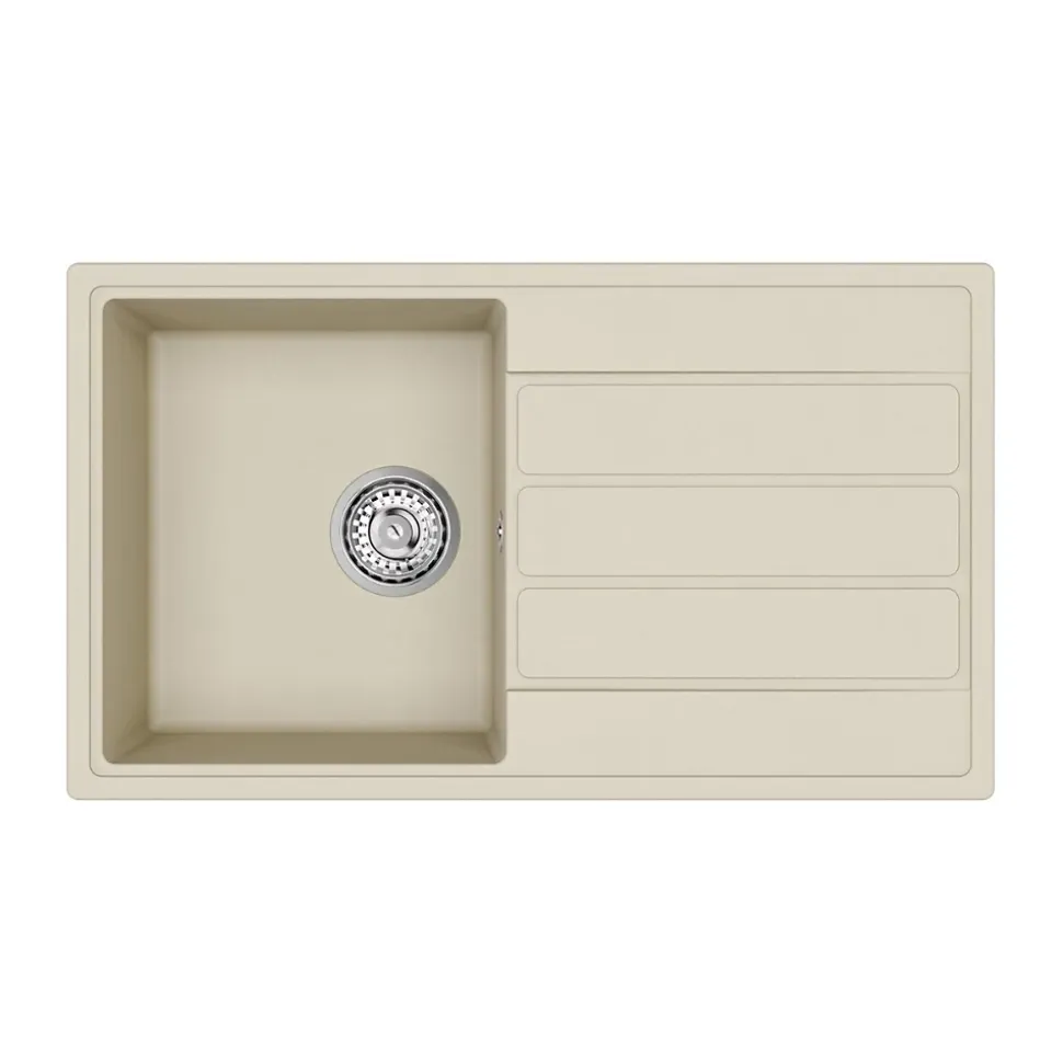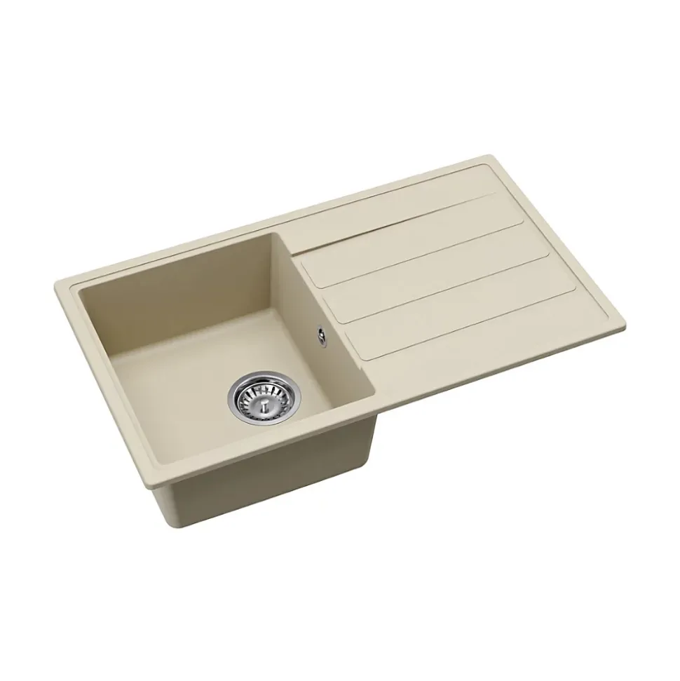 Caractéristiques de l’Evier 76×44 cm avec égouttoir réversible en Granite, à encastrer, Jasmin (SATSINKGE3J) :Coloris : JasminMatière : Granite Sous-meuble : 45 cm Dimensions de l’évier : 76×44 cmDimensions de la découpe : 74×42 cm Dimensions de la cuve : 38x33x17 cmEgouttoir réversible 2 trous pour robinetterie pré-percésTrop plein inclus Bonde, siphon, accessoires de montage compris;