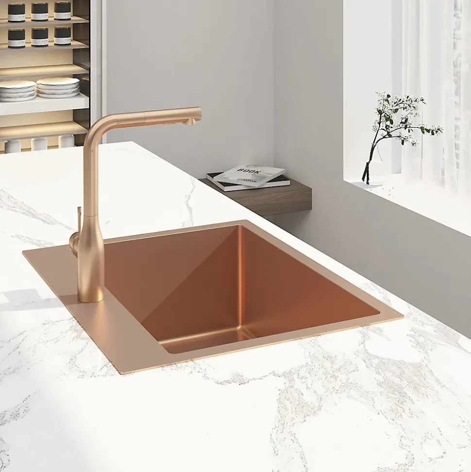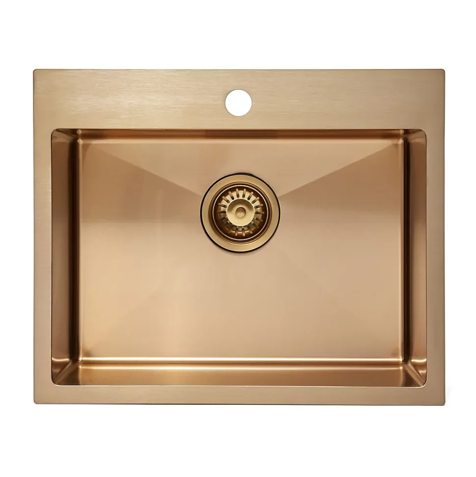 Caractéristiques de l’évier à encastrer en acier inoxydable 304, 55x45x21 cm, avec trop plein, cuivre brossé PVD (SATSINK5545BRG):Matière: Acier inoxydable 304Coloris : Cuivre brosé PVDDimensions: 55x45x21 cmÉpaisseur : 1,5 mmType d’installation : À encastrerAvec trop pleinTrou percé pour robinetterieDiamètre de la bonde : 90mmLivré sans siphon