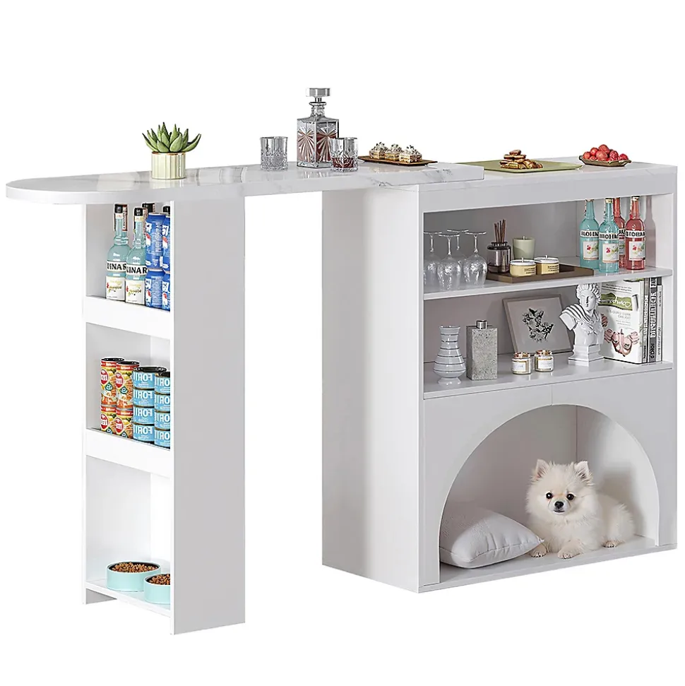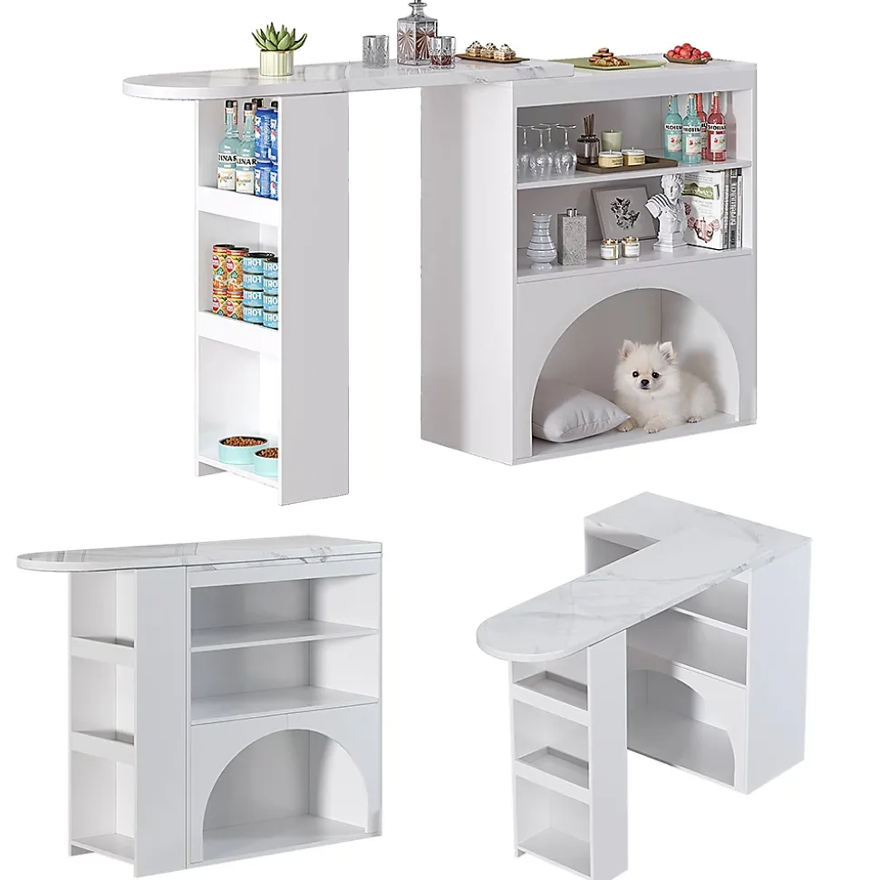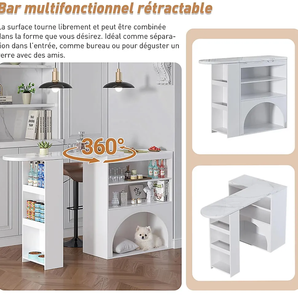 Caractéristiques du produit1. Système d’extension flexible : la surface de travail principale (120 cm) s’étend jusqu’à environ 180 cm (zone d’extension d’environ 80 cm) – pour les repas à plusieurs ou la préparation temporaire, avec une extension facile ; une fois repliée, elle se transforme en table de bar élancée, parfaite pour les petits espaces, alliant « extension » et « gain de place ».2. Passage en arc adapté aux animaux domestiques : dans la partie inférieure, le passage en arc sert d’espace de repos pour les animaux domestiques (lit pour chat/chien) et d’espace de rangement pour les jouets/la nourriture, ce qui facilite l’interaction entre les humains et les animaux domestiques ; le design en arc adoucit les bords durs et crée un aspect plus doux.Longueur assemblé (cm) : 120,00Largeur assemblé (cm) : 40,00Hauteur assemblé (cm) : 100,00Poids du produit (kg) : 35,20Dimensions du colisSous-article 1 : 93,98 * 48,26 * 13,34 cm 18,25 kgSous-article 2 : 134,62 * 48,26 * 12,95 cm 21,7 kgInformations sur le produitPlateau de table : capacité de charge de 30 kg ;Tablettes et espaces de rangement latéraux : capacité de charge de 15 kg chacun ;Espace de repos pour animaux : capacité de charge de 40 kg.Lieu d’origine : ChineCouleur principale : blancMatériau principal : MDF