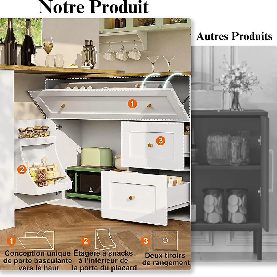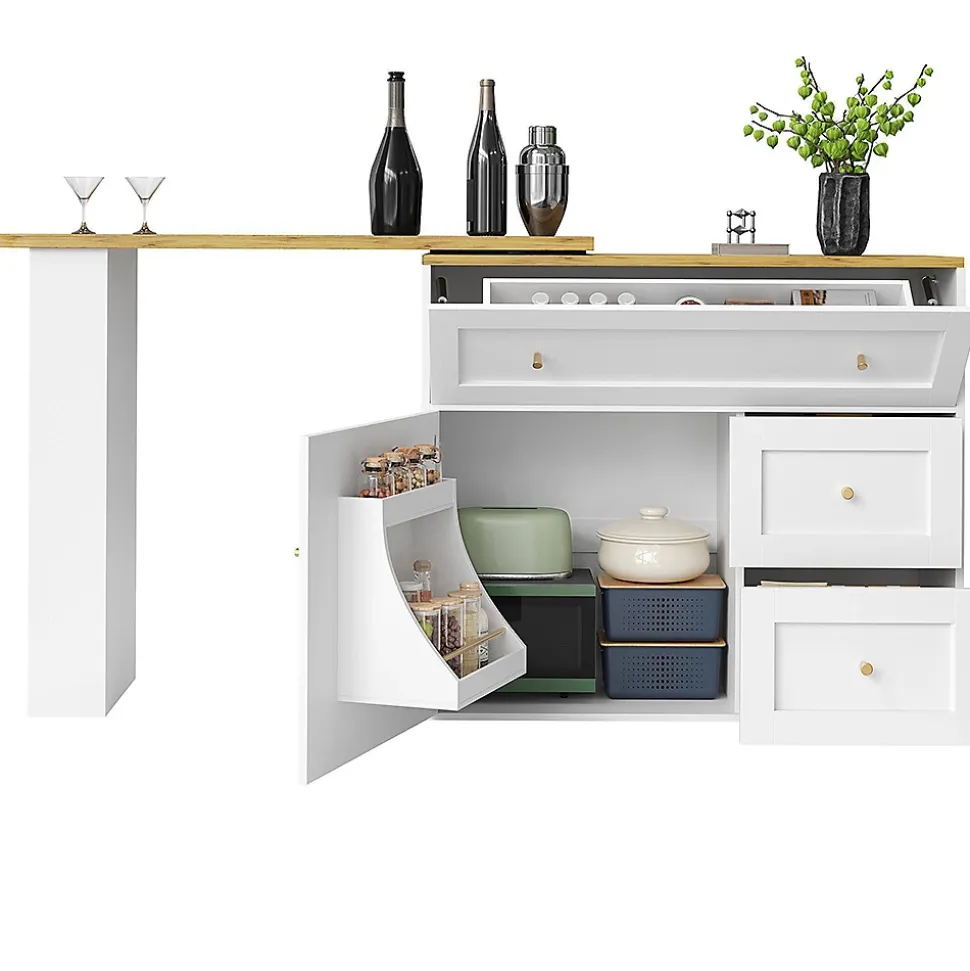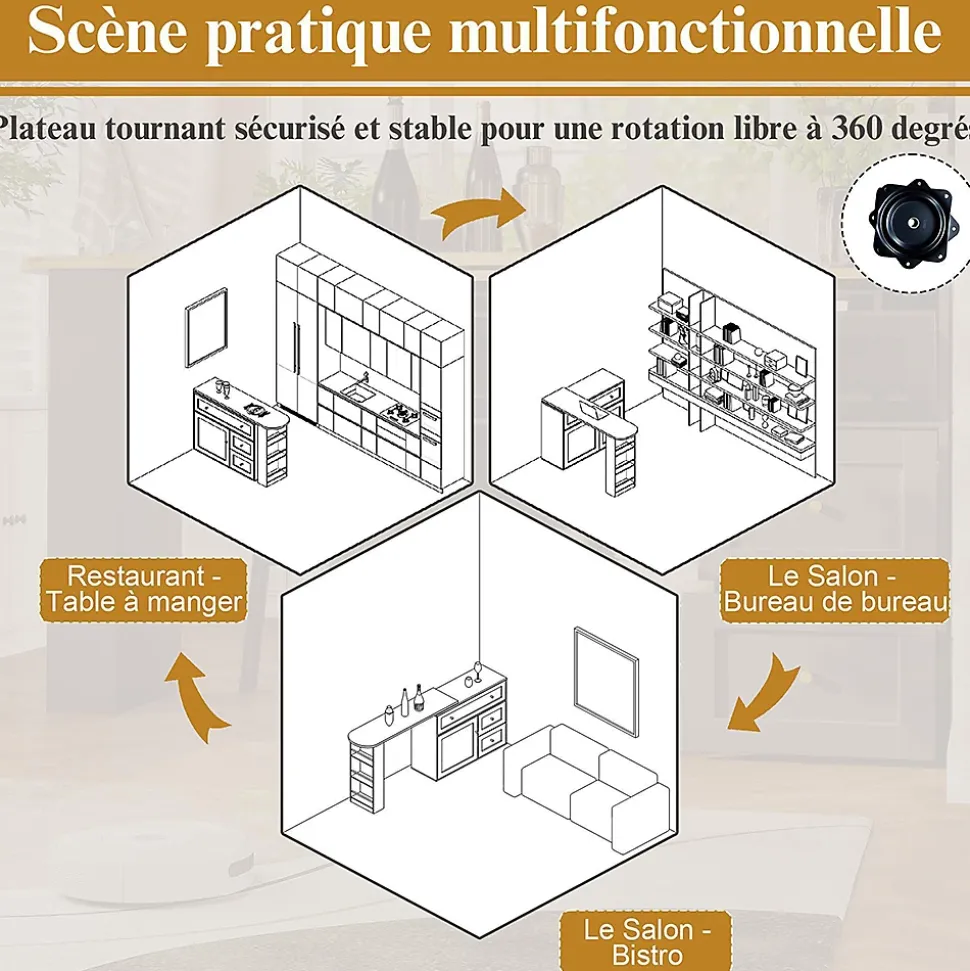 Caractéristiques du produitDesign raffiné : matériau MDF de haute qualité, portes d’armoire tridimensionnelles élégantes et plateau de table aux motifs raffinés, rehaussé de charmantes poignées métalliques – un signe d’un savoir-faire artisanal exceptionnel.Espace de rangement multifonctionnel : étagère à snacks unique vers le haut, rangement intégré dans la porte de l’armoire et deux tiroirs rabattables offrant de nombreuses possibilités de rangement pour différents besoins.Plateau tournant à 360 degrés : sûr et stable, le plateau tournant permet une rotation libre à 360 degrés pour un accès facile aux objets et plus de confort.Utilisations polyvalentes : idéal pour les restaurants, les salons, les bureaux et plus encore, parfait pour les soirées conviviales ou les pauses détendues au travail.Conception innovante à abattant : la construction à abattant peu encombrante allie modernité et fonctionnalité, pour un mariage harmonieux entre esthétique et praticité.Dimensions de l’emballageSous-article 1 : 152,4 * 47,63 * 15,88 cm 28,05 kgSous-article 2 : 120,02 * 67,95 * 13,97 cm 28,8 kgDétails du produitDimensions du produit 138-204*39*105 cmPoids du produit 52,85 kg/tableMatériau MDF, métalPoids supporté 60 kg/tableAssemblage requis 30 minutesContenu de la livraison 1x table de bar avec instructions de montage et matériel d’assemblageNombre de colis 2Pays d’origine ChineCouleur principale : blancMatériau principal : MDF + métal