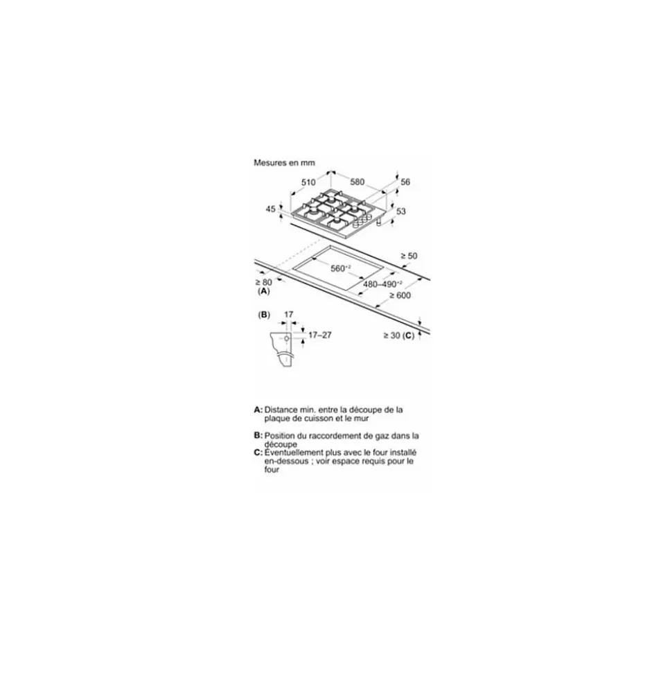 Table de cuison gaz 60cm 7500w 4 feux inox Bosch – Table de cuison gaz PBP6B5K80 de Bosch.La plaque de cuisson gaz de 60 cm, PBP6B5K80, de Bosch combine performance, sécurité et design moderne pour répondre aux besoins des cuisiniers exigeants.Son revêtement en inox lui confère une esthétique élégante et intemporelle, tout en garantissant une grande robustesse et une facilité d’entretien optimale.Dotée de quatre foyers de cuisson, elle offre une polyvalence totale pour s’adapter à tous types de préparations culinaires, du mijotage doux à la cuisson intense. Son puissant brûleur de 3000 Watts est parfait pour les cuissons rapides comme le sautage de légumes, la cuisson des viandes ou encore l’ébullition rapide de l’eau.Son système d’allumage intégré permet une mise en marche rapide et sécurisée, tandis que ses supports en fonte assurent une stabilité parfaite des ustensiles.Pensée pour un confort d’utilisation maximal, cette table série 2 est équipée de commandes frontales ergonomiques, offrant un accès intuitif et un réglage précis de la flamme.Enfin, son système de sécurité par thermocouple garantit une utilisation en toute sérénité en coupant automatiquement l’arrivée de gaz en cas d’extinction accidentelle de la flamme. – Type de produit : Table de cuisson.Type table de cuisson : Gaz.Type d’installation : Encastrable.Gamme : Série 2.Système de commandes : Manette losangée.Emplacement du bandeau de commande : Latérale.Matière des grilles : Acier émaillé.Nombre de foyers : 4.Nombre de booster : 0.Type de foyer : Rond.Puissance foyer ARG/ARD (en W) : 1750 / 1750.Puissance foyer AVG/AVD (en W) : 3000 / 1000.Bandeau de commande : Latéral.Nature des commandes : Boutons ergonomiques.Allumage électronique : Oui.Sécurité thermocouple : Oui.Injecteur (Gicleur) : Gaz de ville et butane.Minuterie : Non.Option Boost : Non.Plaque aspirante :