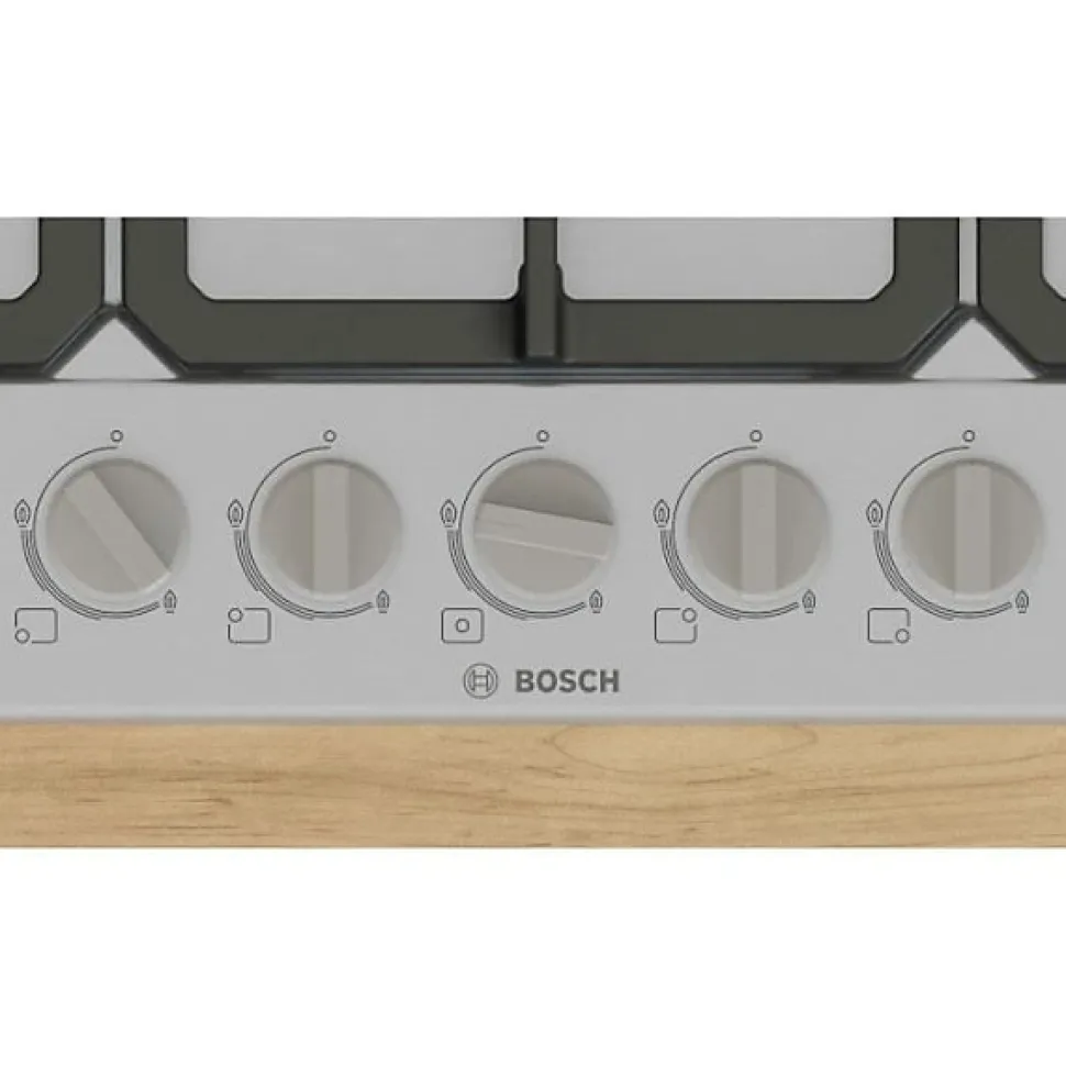 Table de cuisson gaz encastrable 75 cm Bosch 5 foyers avec brûleur Wok 3,3 kW, allumage électrique, sécurité thermocouple, surfaces inox et supports fonte robustes. Compatible gaz naturel et butane/propane, injecteurs fournis. Puissance totale 10 800 W.