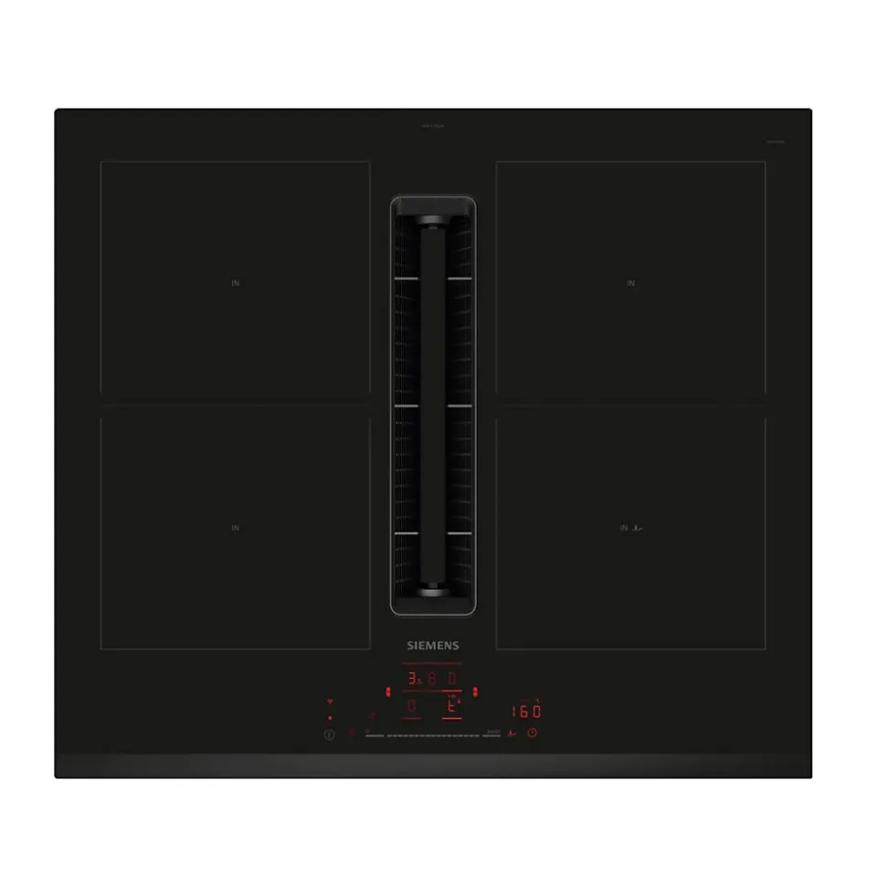 Table de cuisson aspirante induction 59cm 4 feux 7400w noir Siemens – Table de cuisson ED631HQ26E de Siemens design avec aspiration intégrée. CombiZone : combinez deux zones de cuisson à induction pour chauffer vos grandes casseroles. TouchSlider :contrôlez la puissance de votre table de cuisson du bout du doigt. Le module d’aspiration d’inductionAir Plus garantit un niveau sonore minimal sans compromettre la puissance d’extraction. Une hotte intégrée facile à nettoyer. Home Connect : obtenez des informations sur votre table de cuisson où que vous soyez via tablette ou smartphone. – Type de produit : Foyer en vitrocéramique.Design : Encastrable.Type d’énergie : Électrique.Témoin de chaleur résiduelle : Indépendant.Emplacement du bandeau de commande : Devant.Matériau de la surface : Vitrocéramique.Brûleurs : Non.powerBoost : Toutes les zones de cuisson.Puissance du 2nd foyer : 3.6 kW.Nombre de vitesses : 9-stage + 2 intensive.Débit d’aspiration max. en évacuation : 500 m³/h.Débit de l’aspiration en Recyclage d’air position turbo : 595.0 m³/h.Débit d’aspiration max. en recyclage : 487 m³/h.Débit d’air position intensive en évacuation : 622 m³/h.Niveau Sonore : 69 dB(A) re 1 pW.Filtre anti-odeurs : Non.Accessoires inclus : 1 x Connecteur télescopique mode recyclage, 1 x Filtre à charbon Clean Air Plus.Puissance de raccordement : 7.4 kW.Tension : 220-240/380-415 V.Fréquence : 50-60 Hz.Couleur de la surface : Noir.Longueur du cordon électrique : 110.0 cm.Niche d’encastrement : 223 x 560-560 x 490-490 mm.Largeur : 592 mm.Dimensions appareil H x L x P : 223 x 592 x 522 mm.Poids net : 22.8 kg.