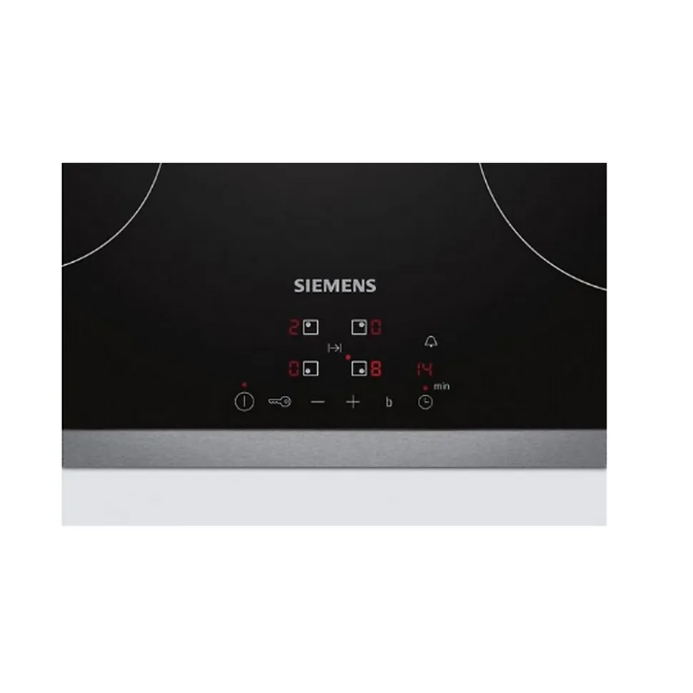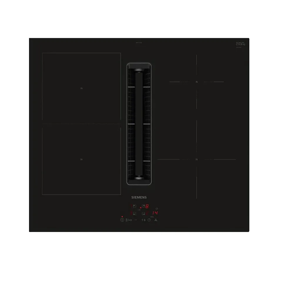 Table de cuisson aspirante induction 60cm 4 foyers 7400w noir Siemens – Table de cuisson aspirante induction iQ300 Siemens ED611BS16E design entièrement intégrée et affleurante. touchControl : pour une commande particulièrement confortable du Table de cuisson avec une seule touche. Facile à nettoyer – effort de nettoyage minimal pour le hotte aspirante intégrée. powerBoost – Augmente la puissance des zones d’induction individuelles jusqu’à 50 %. Éteint la zone de cuisson en toute sécurité – minuterie incluse – Arrêt de sécurité. Empêche en toute sécurité une mise en marche involontaire – sécurité enfants. Dotée de 4 filtres cleanAir Plus, un curseur télescopique et un joint adhésif pour une installation sans conduit. – Type de produit : Table de cuisson aspirante.Type : A induction.Type d’appareil : Coin. cuisineVitrocéramique.TouchControl.4x zones.1 combiZone + Ventilation.Ventilateur à allumage automatique.Puissance totale : 7,4 kW.Sans cadre.Conception : Installation.Source d’énergie : Électrique.Largeur de l’appareil : 592mm.Affichage de la chaleur résiduelle : Séparé.Localisation du contrôle : Devant.Matériau de la surface principale : vitrocéramique.Couleur de la surface : Noir.Longueur du câble de connexion : 110,0 cm.Plaque de cuisson scellée : Non.Chauffages avec booster : Tous.Puissance de la 2ème zone de cuisson (kW) : 3,6 kW.Puissance de la 5ème zone de cuisson (kW) : 1,4 kW.Puissance maximale du ventilateur pour l’air évacué : 500 m³/h.Performance du ventilateur en mode recyclage d’air intensif : 595,0 m³/h.Puissance maximale du ventilateur pour l’air circulant : 441 m³ /H.Performance du ventilateur en mode évacuation intensive : 622 m³/h.Son : 69 dB(A) pour 1 pW.Filtre anti-odeurs : Non.Tension : 220-240/380-415V.Fréquence : 50-60 Hz.Accessoires intégrés : 1 x élément coulissant télescopique pour
