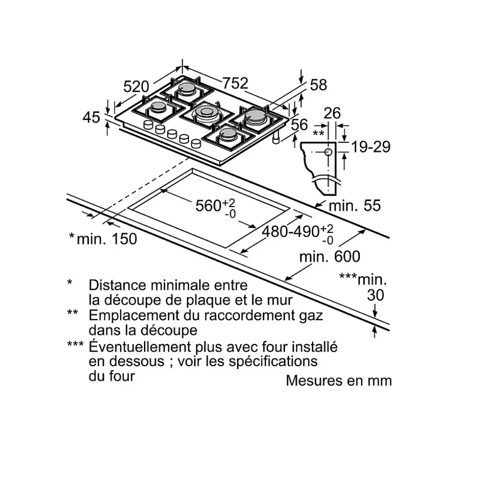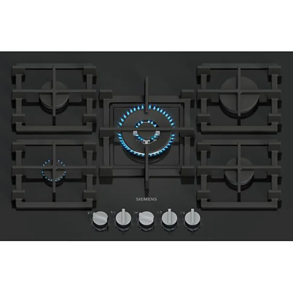 Table de cuisson gaz 75cm 5 feux 11500w noir Siemens – Table de cuisson gaz en verre trempé iQ500 de Siemens EP7A6QI40 avec technologie stepFlame pour un contrôle précis de la flamme, avec boutons amovibles et supports de casseroles semi-continus pour un nettoyage facile.Technologie stepFlame : contrôle précis de la flamme avec neuf réglages différents.Boutons métalliques amovibles : pour un nettoyage aisé et un contrôle précis de la cuisson.Support de casserole semi-continu : facile à manipuler et à nettoyer.Surface en verre trempé noir : extrêmement résistant à la chaleur.Verrouillage de sécurité du gaz : arrête instantanément le flux de gaz si la flamme s’éteint, garantissant ainsi la sécurité. – Type de produit :Table de cuisson gaz.Type: Table verre.Gamme : iQ500.Type d’encastrement : A semi-fleur de plan de travail.Nbre foyer(s) : 5.Type de commande(s) : Manettes.Emplacement des commandes : Frontales.Type d’allumage : Intégré une main.Zone de cuisson modulable (flex) : Non.Foyer le + puissant (W) : 4000.Matière de la surface : Verre.Connecté : Non.Sécurité gaz : Oui.Puissance de raccordement (W) : 11500.Tension (V) : 220-240.Fréquence (Hz) : 50/60.Intensité (A) : 3.Longueur du cordon (m) : 1.Autre(s) fonction(s) : Technologie StepFlame (Ajustez précisément la flamme avec neuf niveaux réglables différents).Couleur : Noir.Hauteur (cm) : 5.4.Largeur (cm) : 75.2.Profondeur (cm) : 52.Encastrement H x L x P (cm) : 4.5 x 56 x 48-49.Poids (kg) : 19.9.